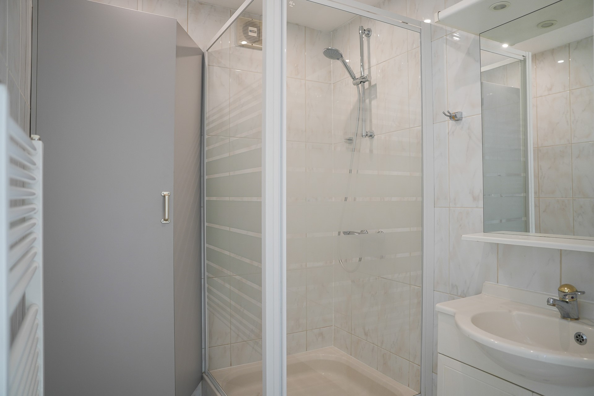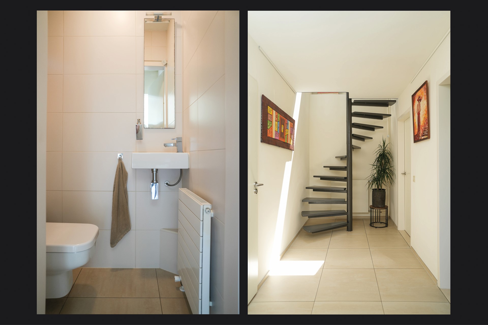 De badkamer is modern en comfortabel, voorzien van een ruime inloopdouche, wastafelmeubel, tweede toilet en vloerverwarming. De hoogte en het hoog geplaatste raam zorgen voor veel daglicht.