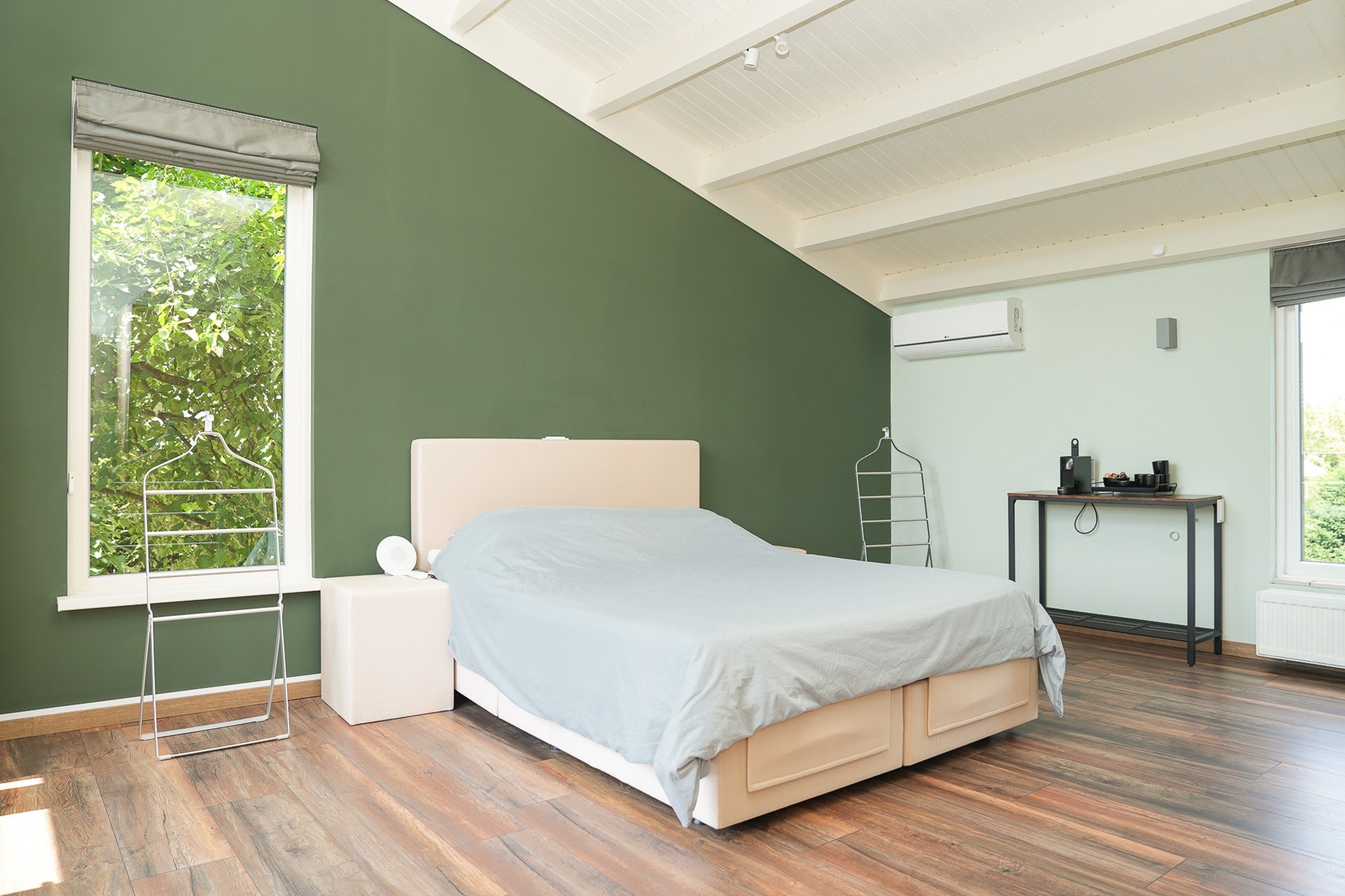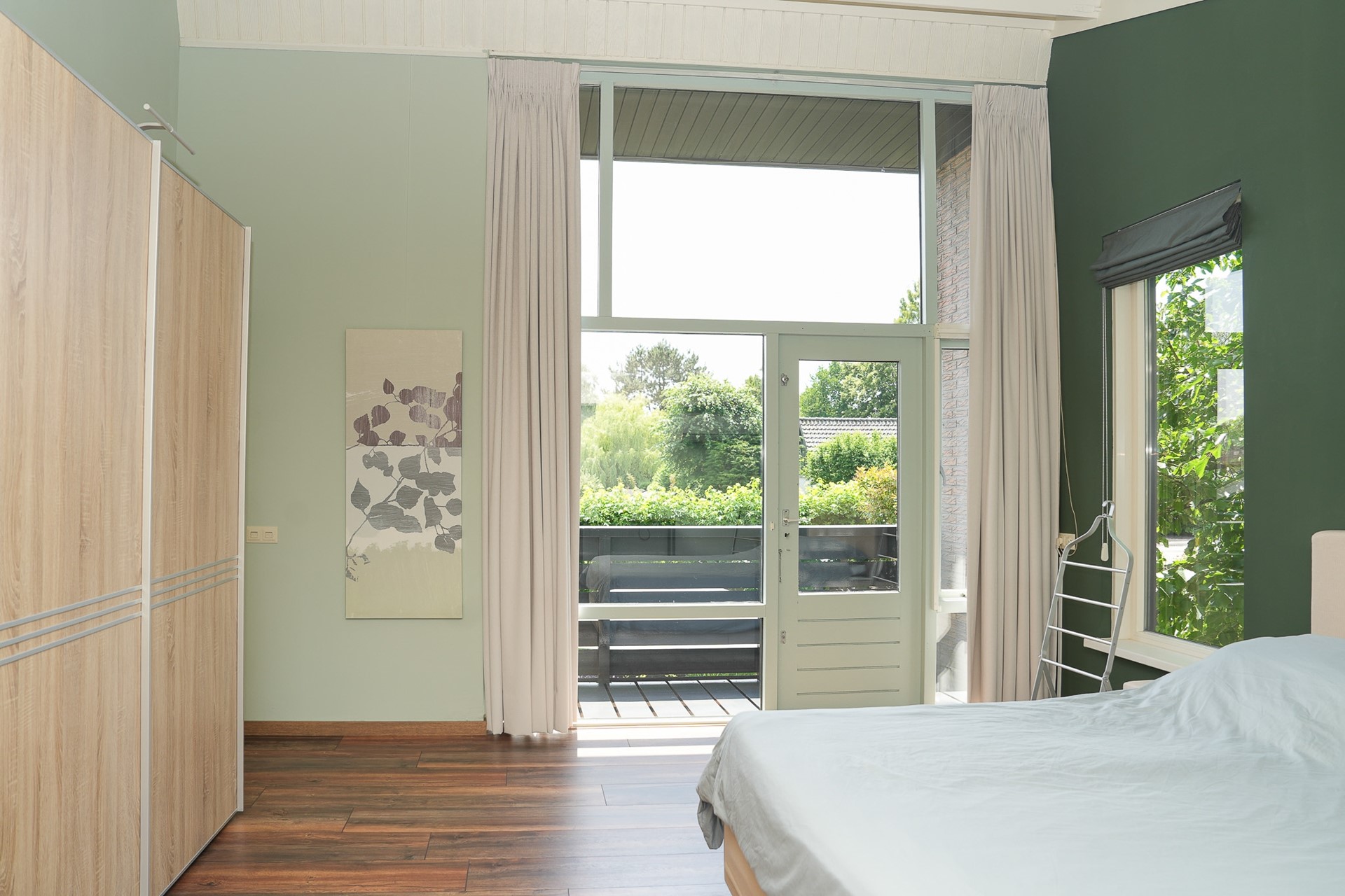 De overloop geeft toegang tot drie ruime slaapkamers. De grootste slaapkamer ligt aan de achterzijde, is voorzien van airconditioning (2021) en een grote raampartij met balkon én uitzicht op de tuin. In het tussenportaal is een ruime inloopkast gerealiseerd.