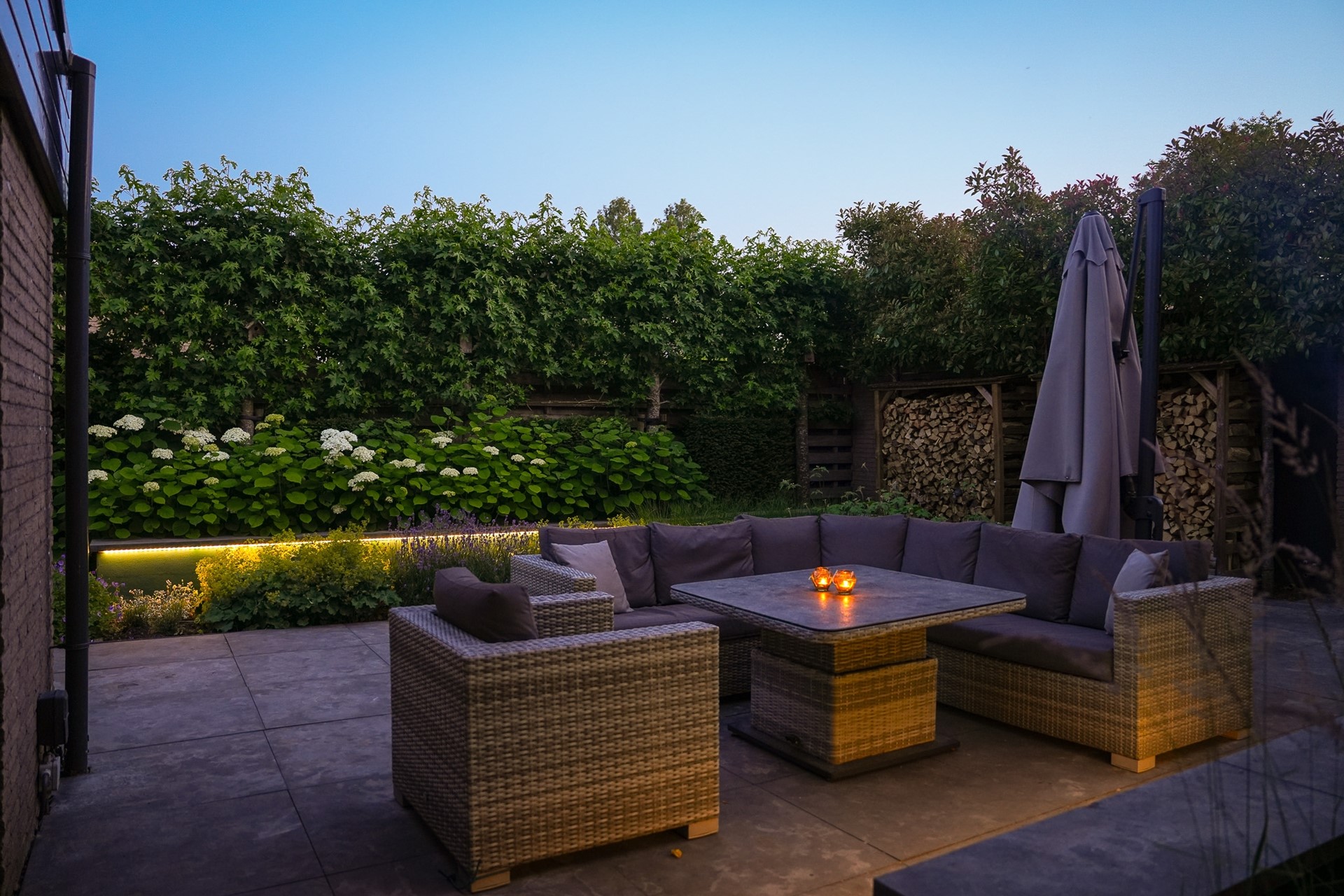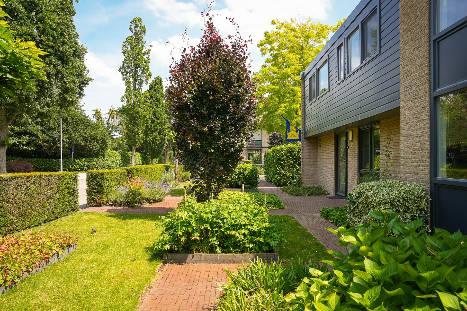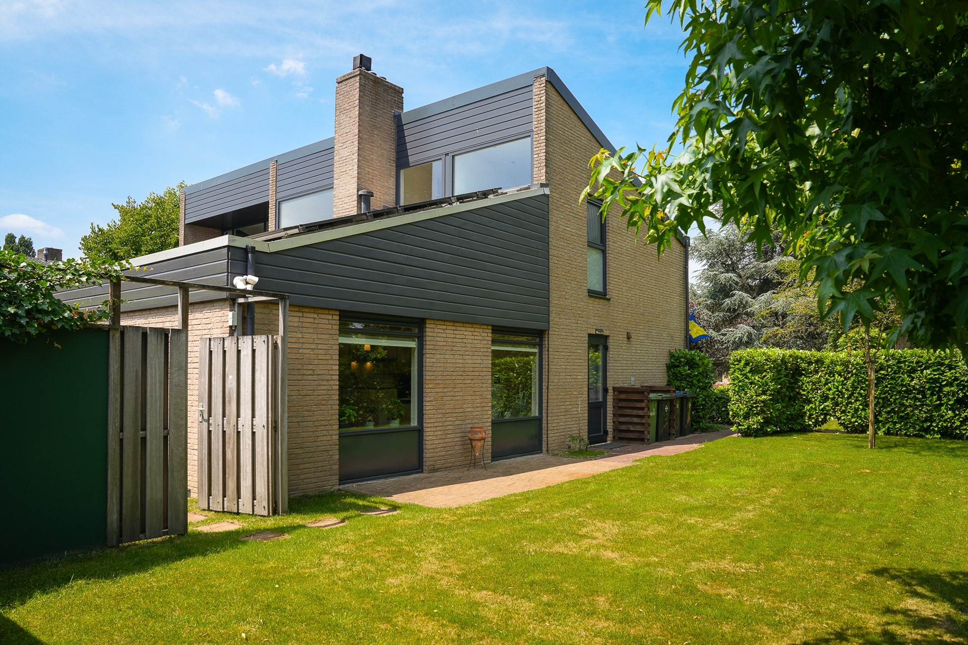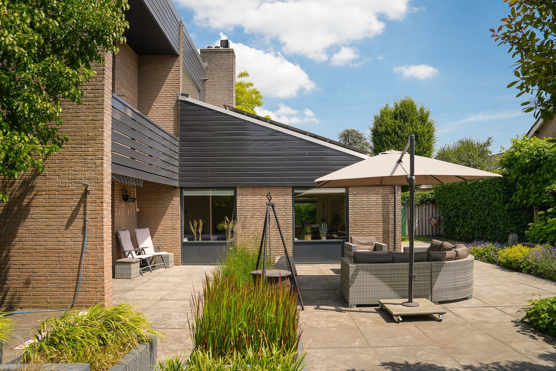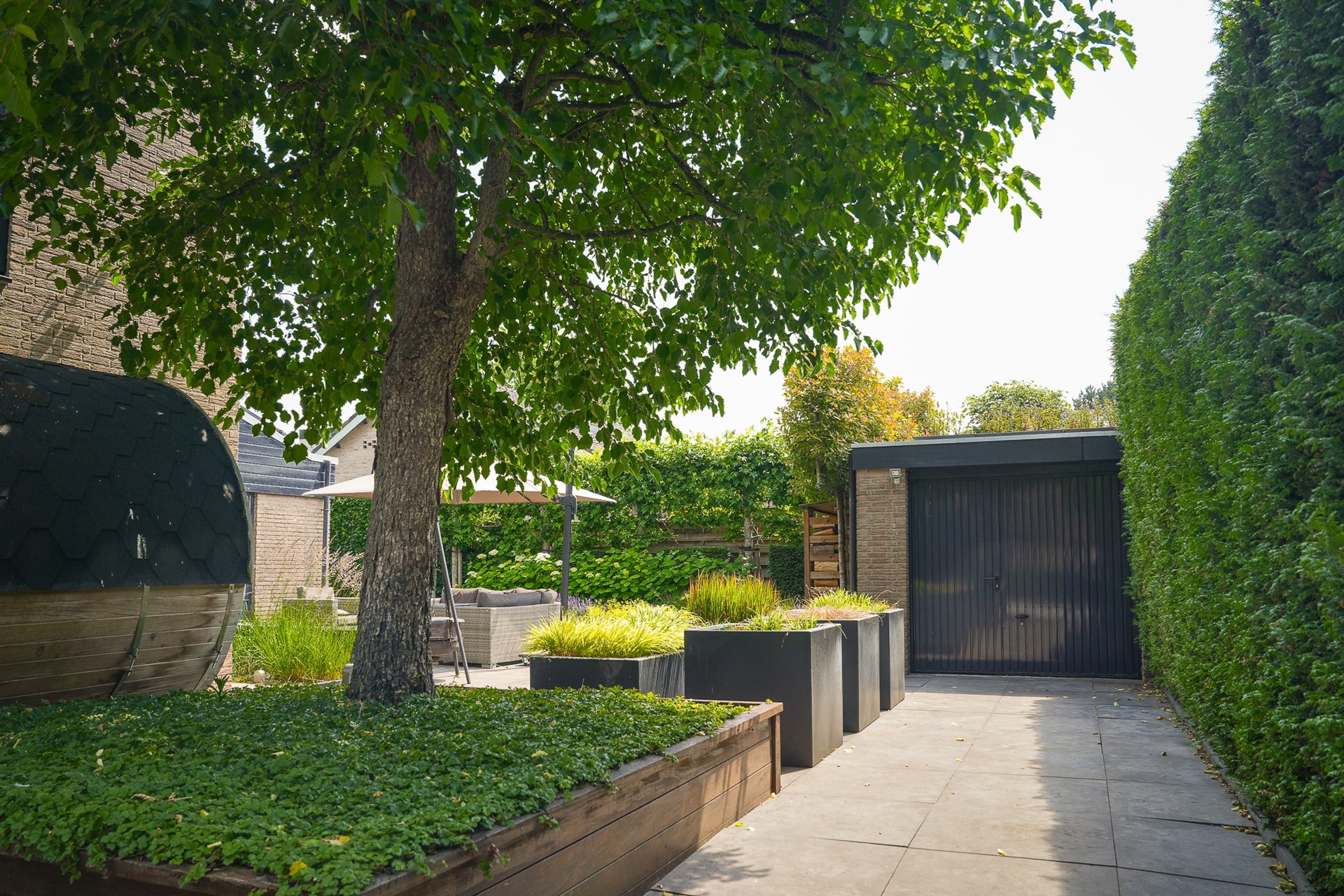 De tuin is schitterend aangelegd. Aan de voorzijde is het groen netjes onderhouden en voorzien van fraaie tuinverlichting. Aan de zijkant is een afsluitbare oprit met grind en hek. Achter de woning ligt een strak vormgegeven tuin met groot terras, borders met vaste planten, een houtopslag en diverse zithoeken.