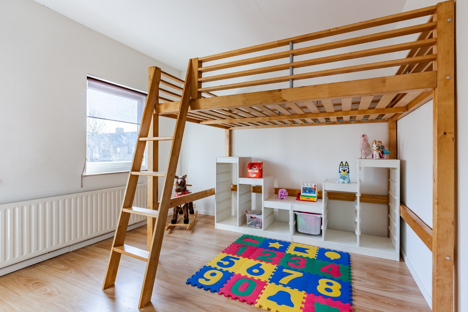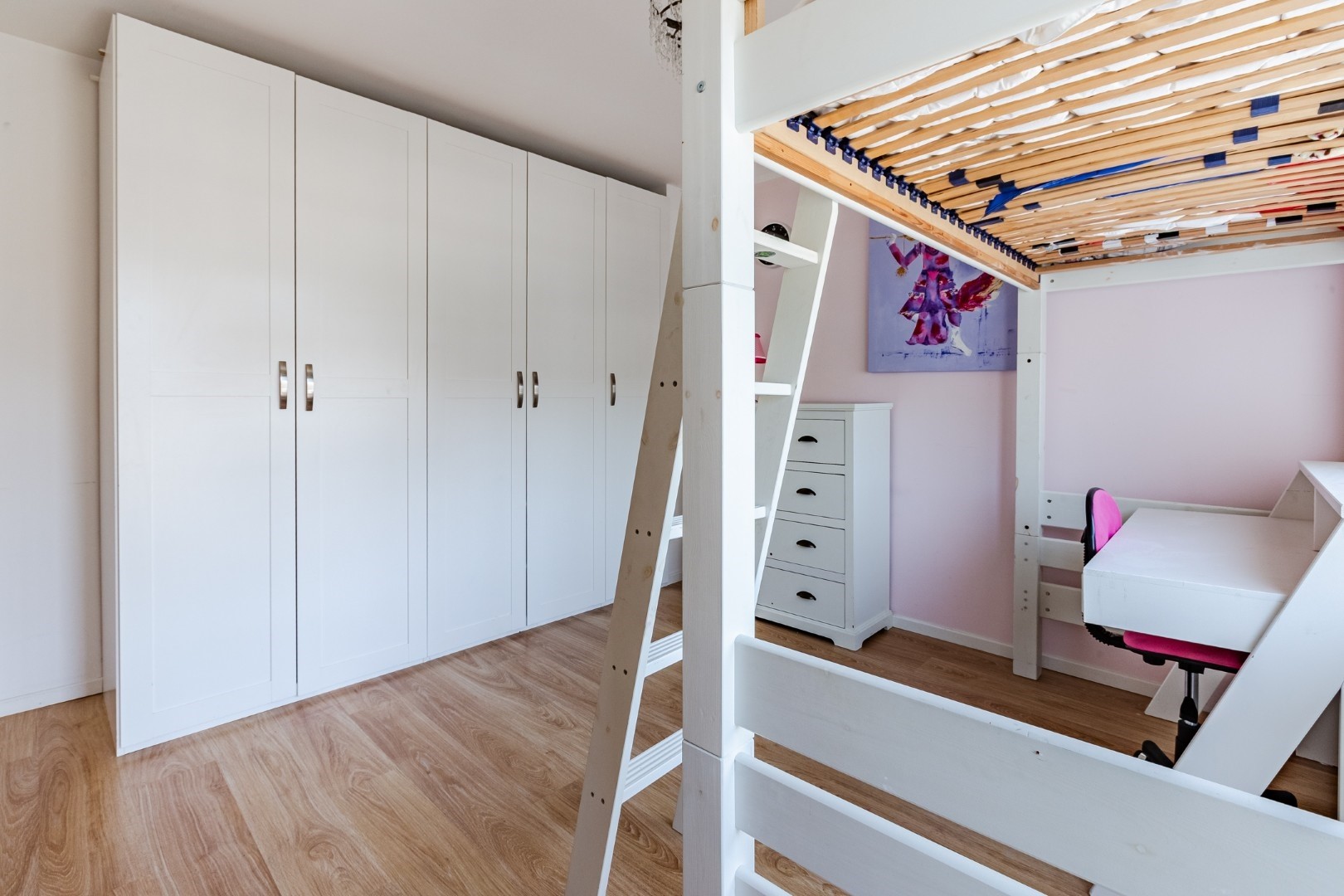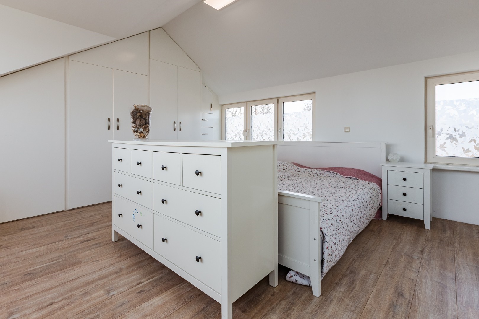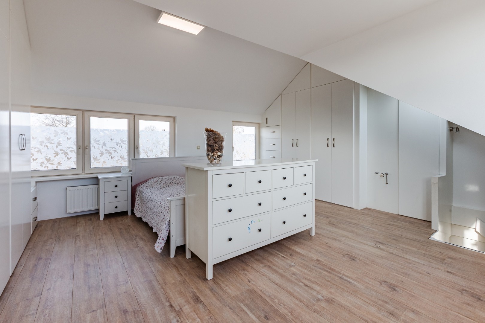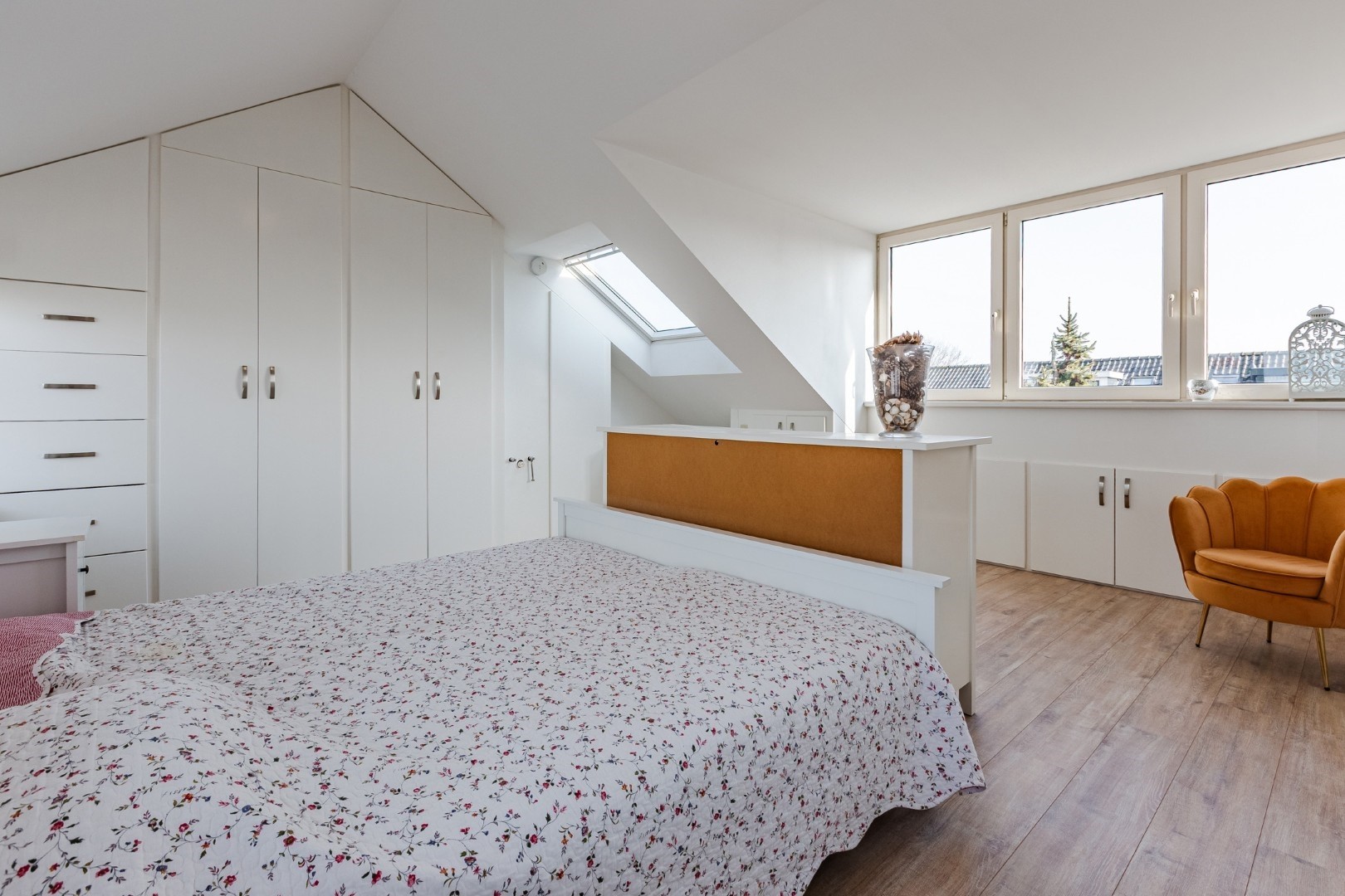De kamer heeft een enorme lichtinval met de 8 te open ramen. Mocht u een extra slaapkamer nodig hebben dan is hier op deze verdieping zeker voldoende ruimte voor, door de verdieping in tweeën te delen.