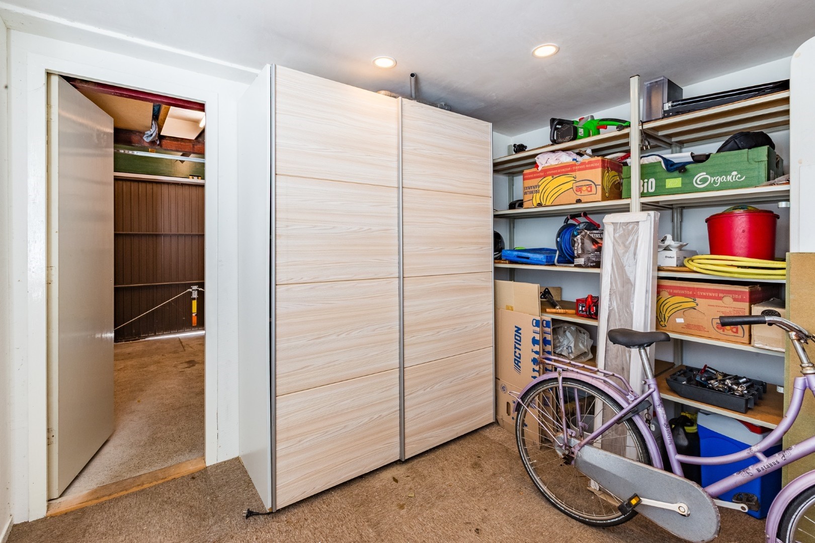 Achter de woning is overdwars een extra ruime garage gelegen. Momenteel is de garage in twee delen gedeeld met een lichte tussenwand, maar deze kan er eventueel ook zeer eenvoudig tussenuit. Dan zou de garage weer één geheel zijn. Bijzonder is dat het voorste del van de garage extra hoogte kent. Het plafond is hier bijna 3 meter hoog. Het achterste deel heeft meer een standaard hoogte. Op zich vermeldenswaardig en een bijzonder detail is dat in het verleden deze garage zelfs de buurtsuper voor de wijk Elsbroek betrof. In plaats van de garageklep was er een pui en loopdeur aanwezig en op het perceel stond de SRV-wagen. Voorts is er vanzelfsprekend stroom en is er thans ook bedraad internet aanwezig. Kortom, deze ruimte is multifunctioneel te gebruiken.