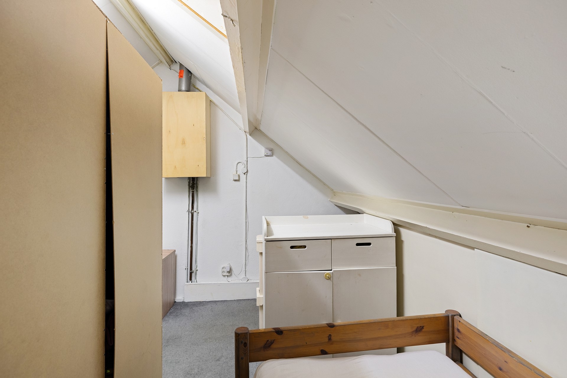 Vanuit de overloop is de zolderetage met een vaste trap bereikbaar. De zolder is een open ruimte die thans in gebruik is als slaapkamer.