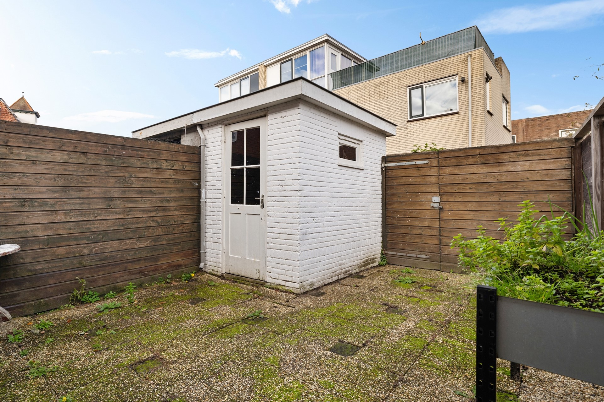 Achtertuin met stenen berging en achterom.