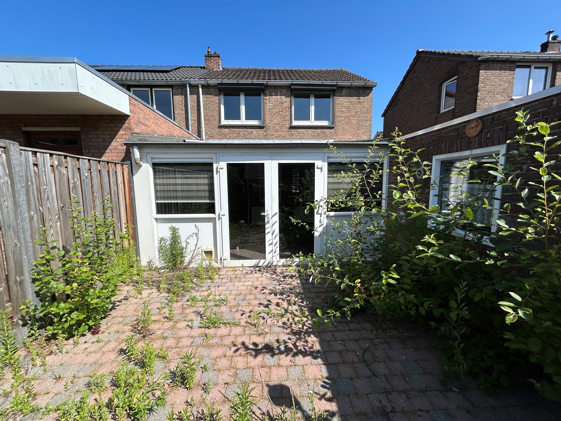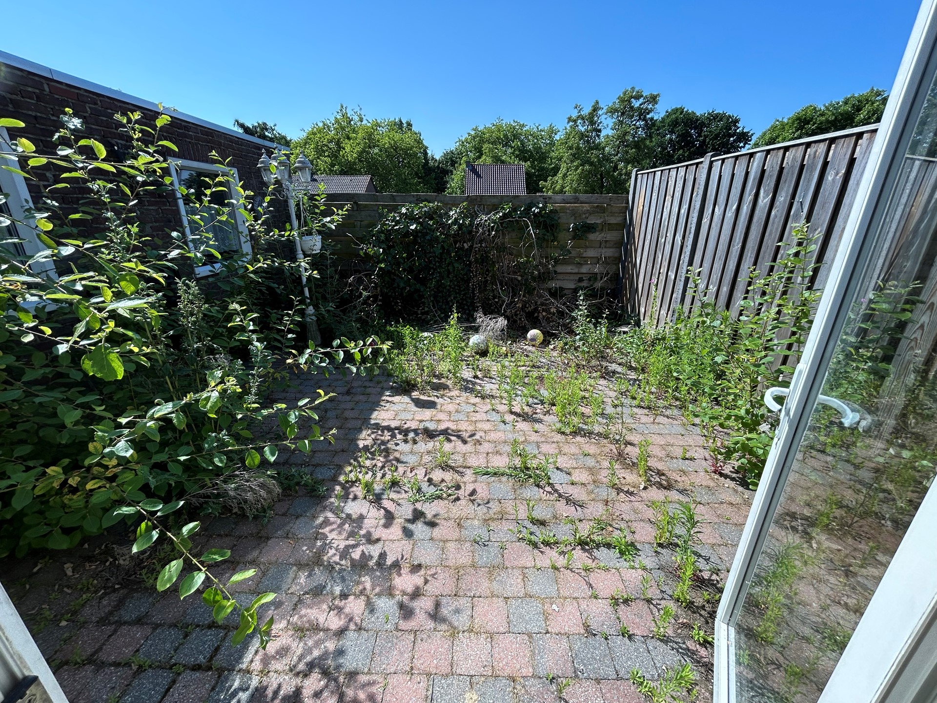 Achtertuin 5,60 x 4,85 met bestrating en houten schuttingen.