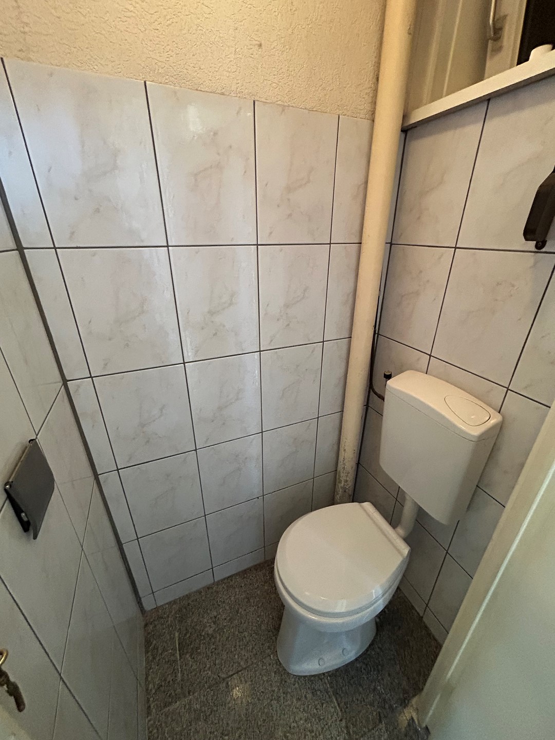 Entree/gang 3,40 x 1,10 met granieten vloer, nieuwe meterkast met slimme stroommeter, toiletruimte 1,10 x 0,65 met granieten vloer en duoblok, deur naar woonkamer en kelder en trap naar verdieping.