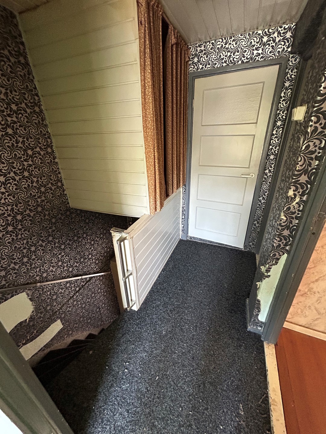 Overloop 2,20 x 0,95 met vloerbedekking en berging.