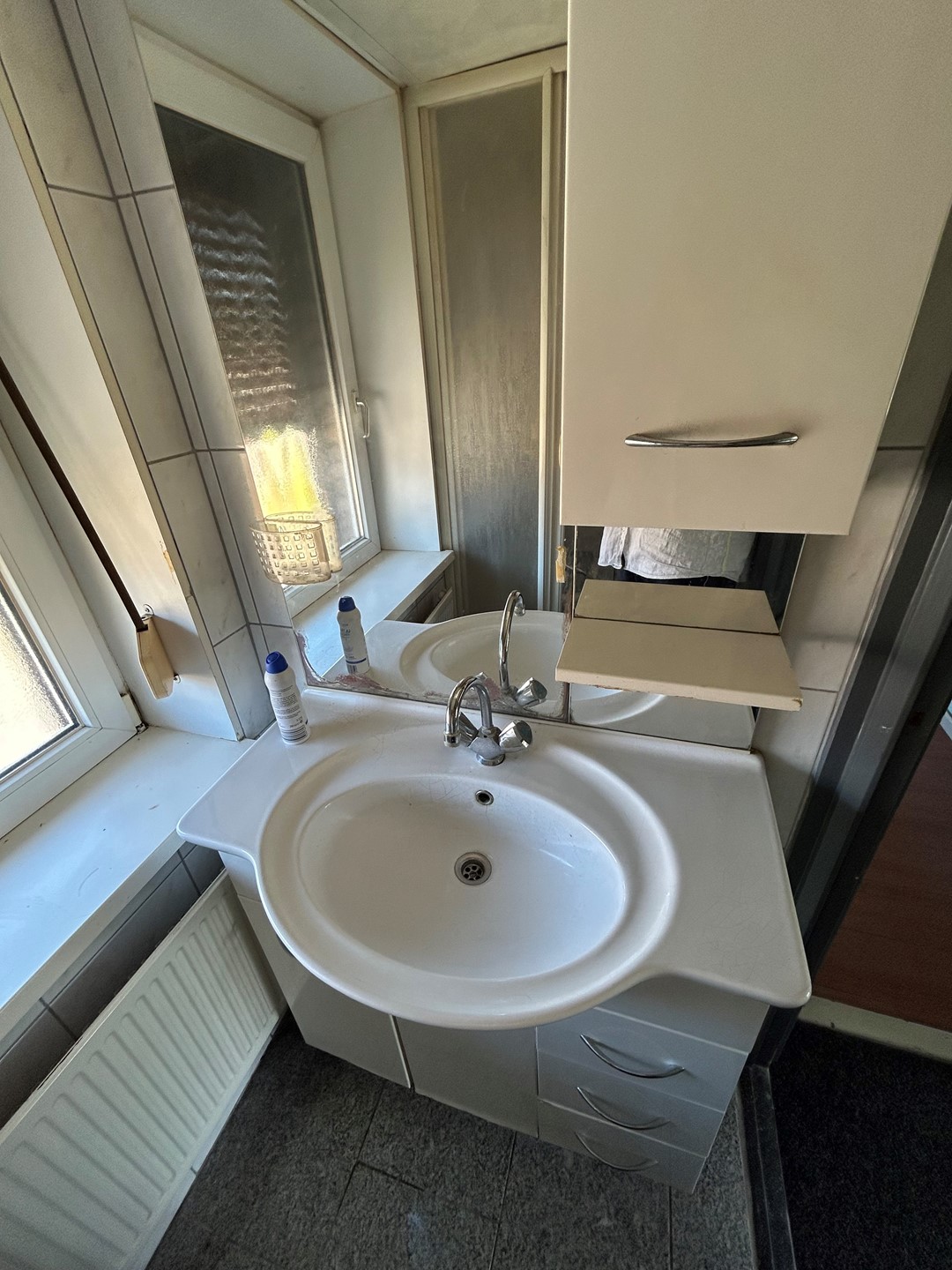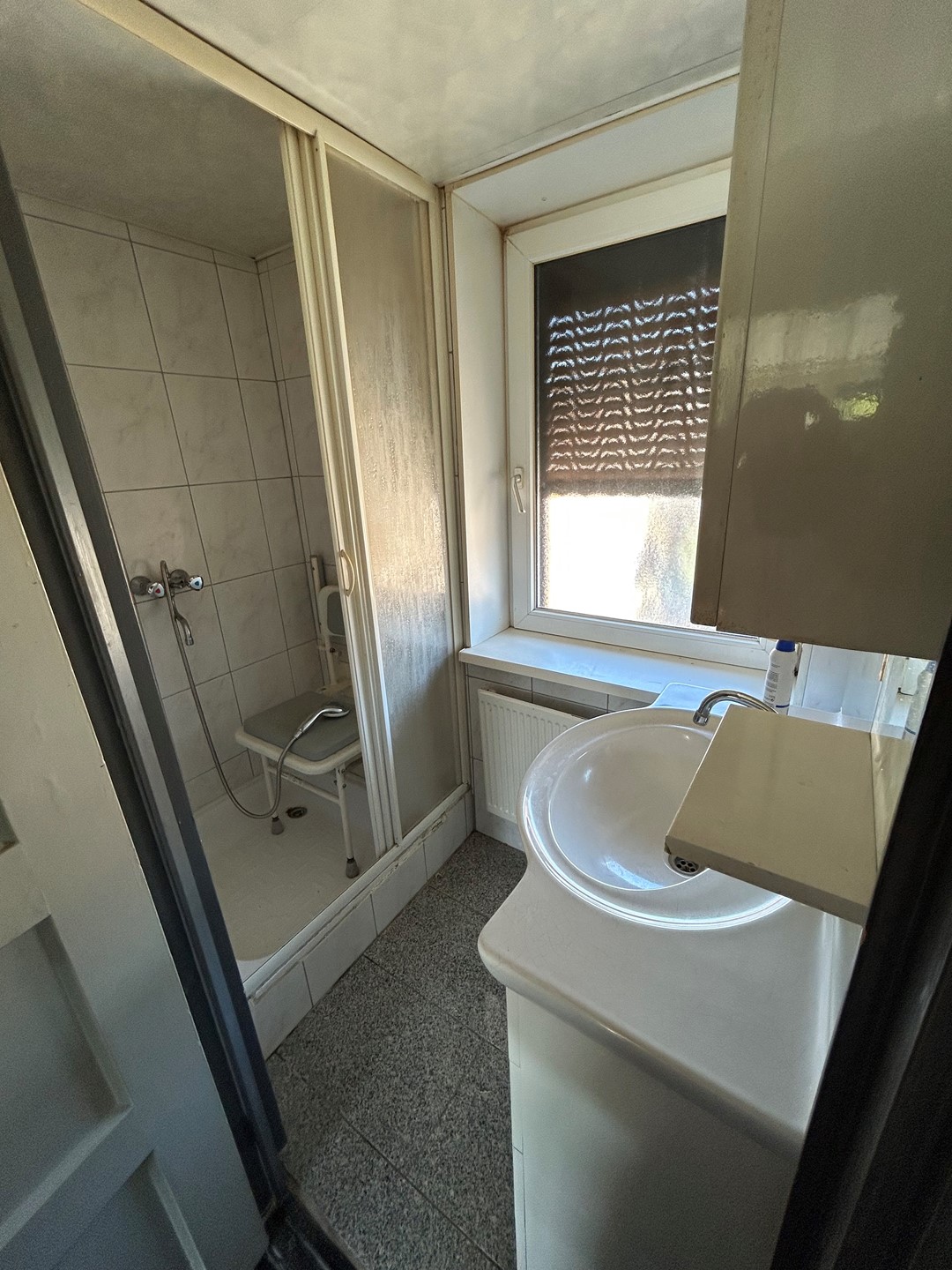 Badkamer 1,85 x 1,05 met granieten vloer, douche en badkamermeubel met wastafel.