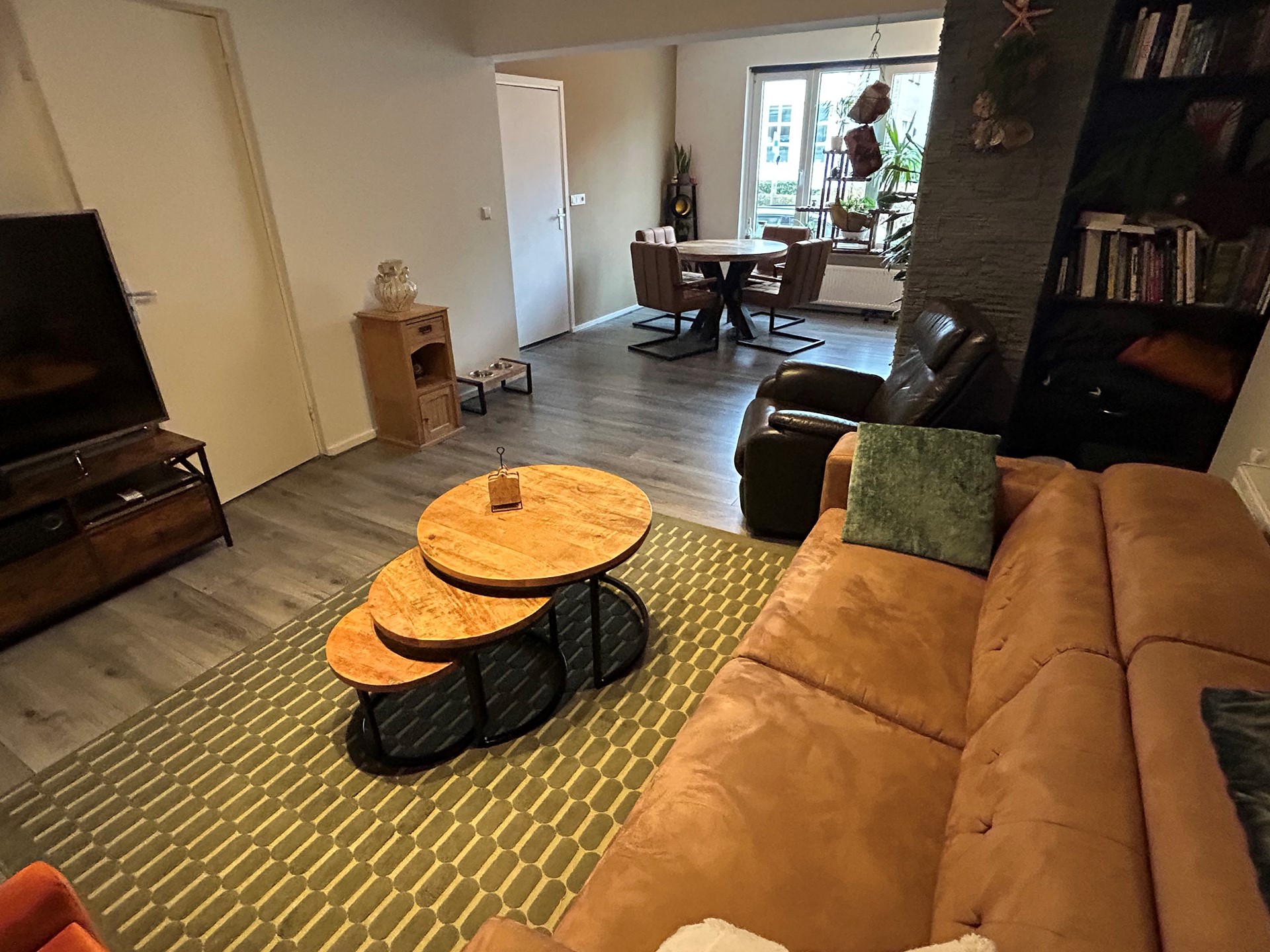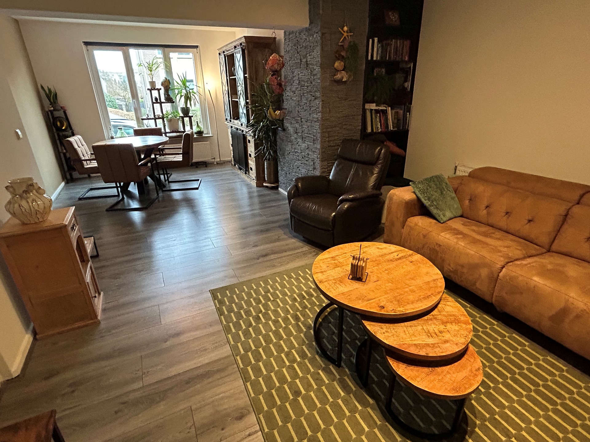 Woonkamer 7,85 x 4,10/3,55 met laminaatvloer en deur naar portaal.