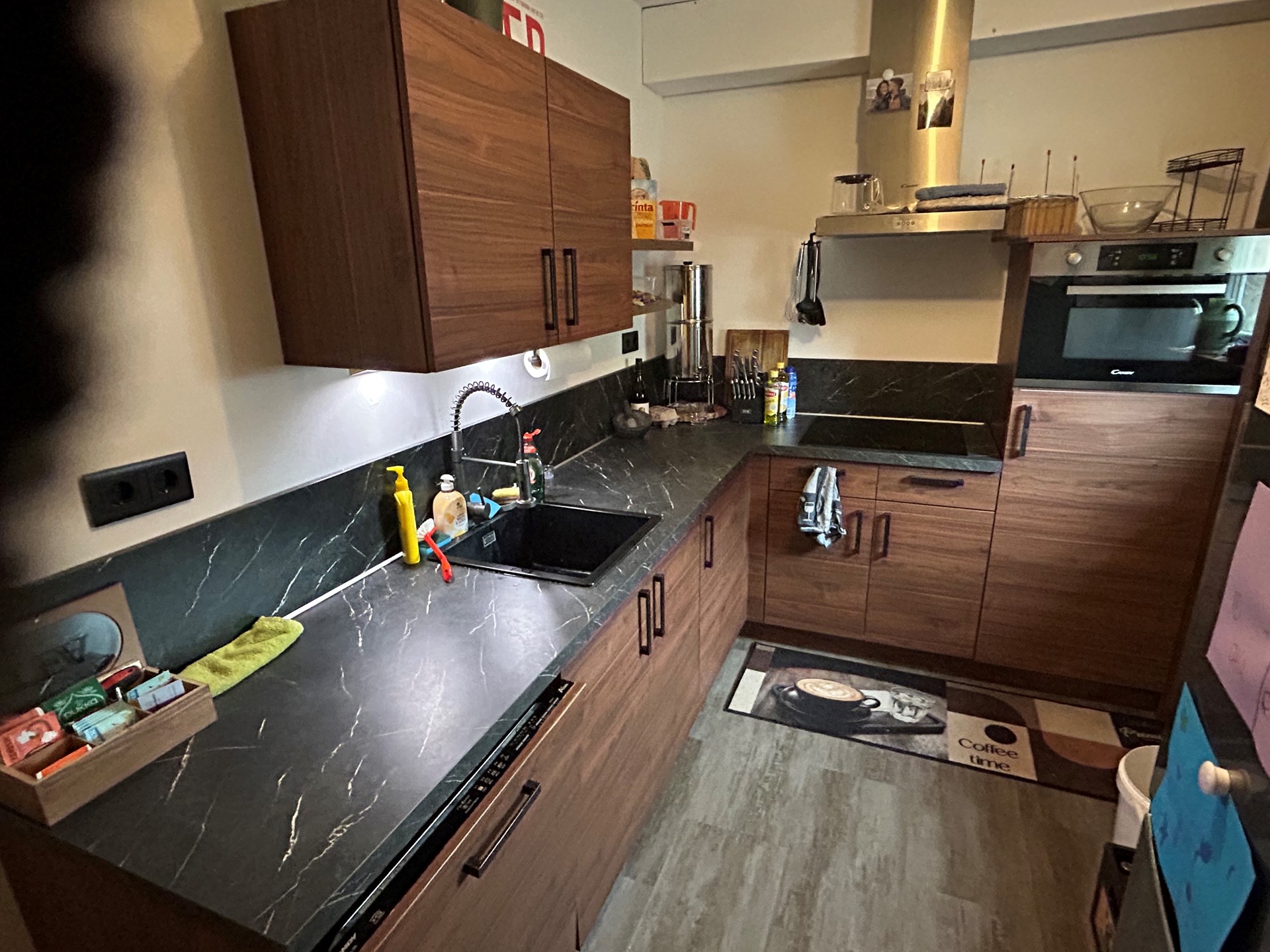 Keuken 3,70 x 2,20/1,50 met pvc laminaatvloer, deur naar stookruimte en mooie aanbouwkeuken met inductie kookplaat met RVS-afzuigunit, koelkast, combi-magnetron, vaatwasser, en spoelbak.