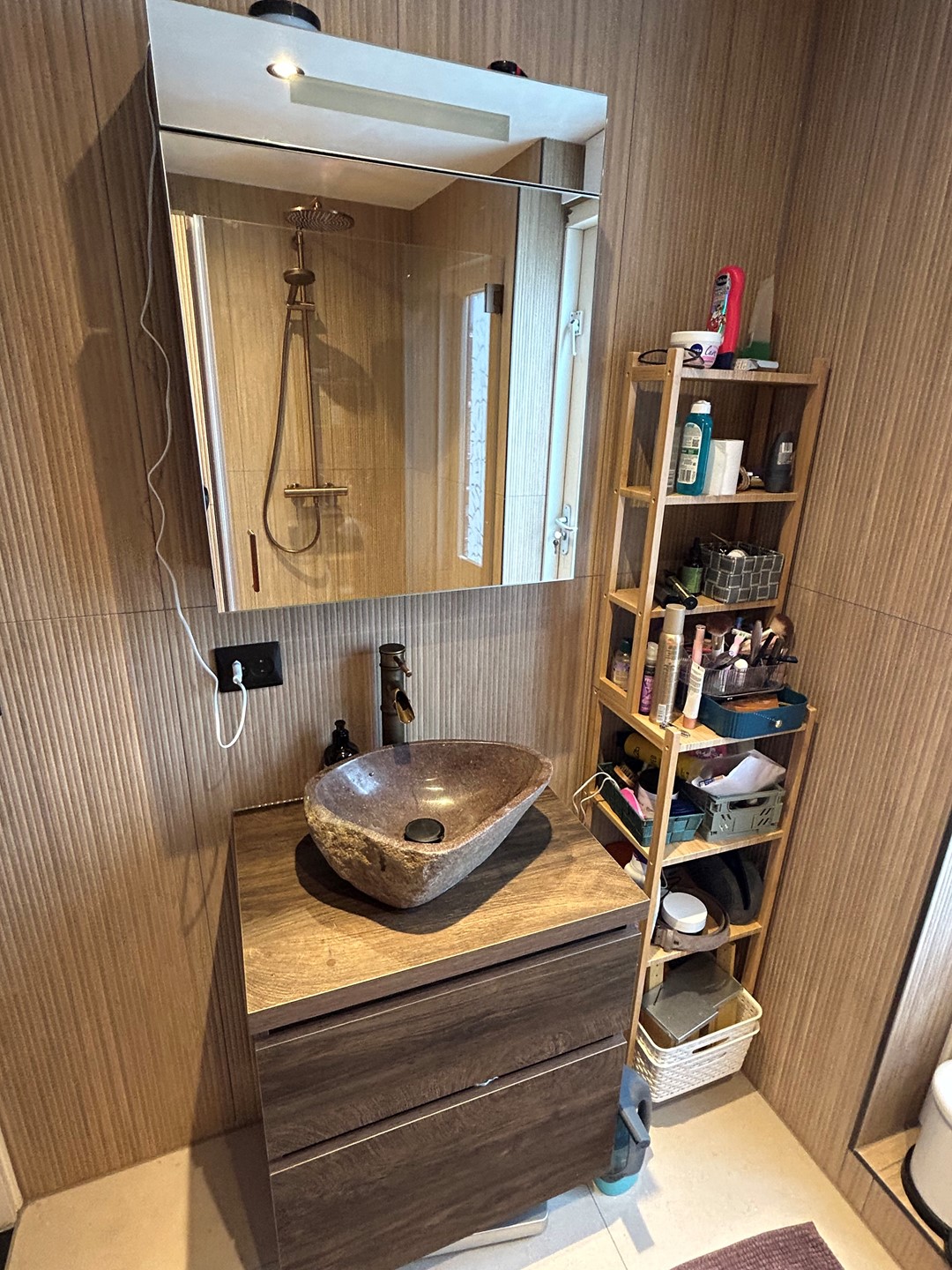 Nieuwe badkamer 2,40 x 1,55 met plavuizenvloer, inbouwspots, inloopdouche, badkamermeubel met wastafel, design radiator en deur naar dakterras 2,50 x 2,00.