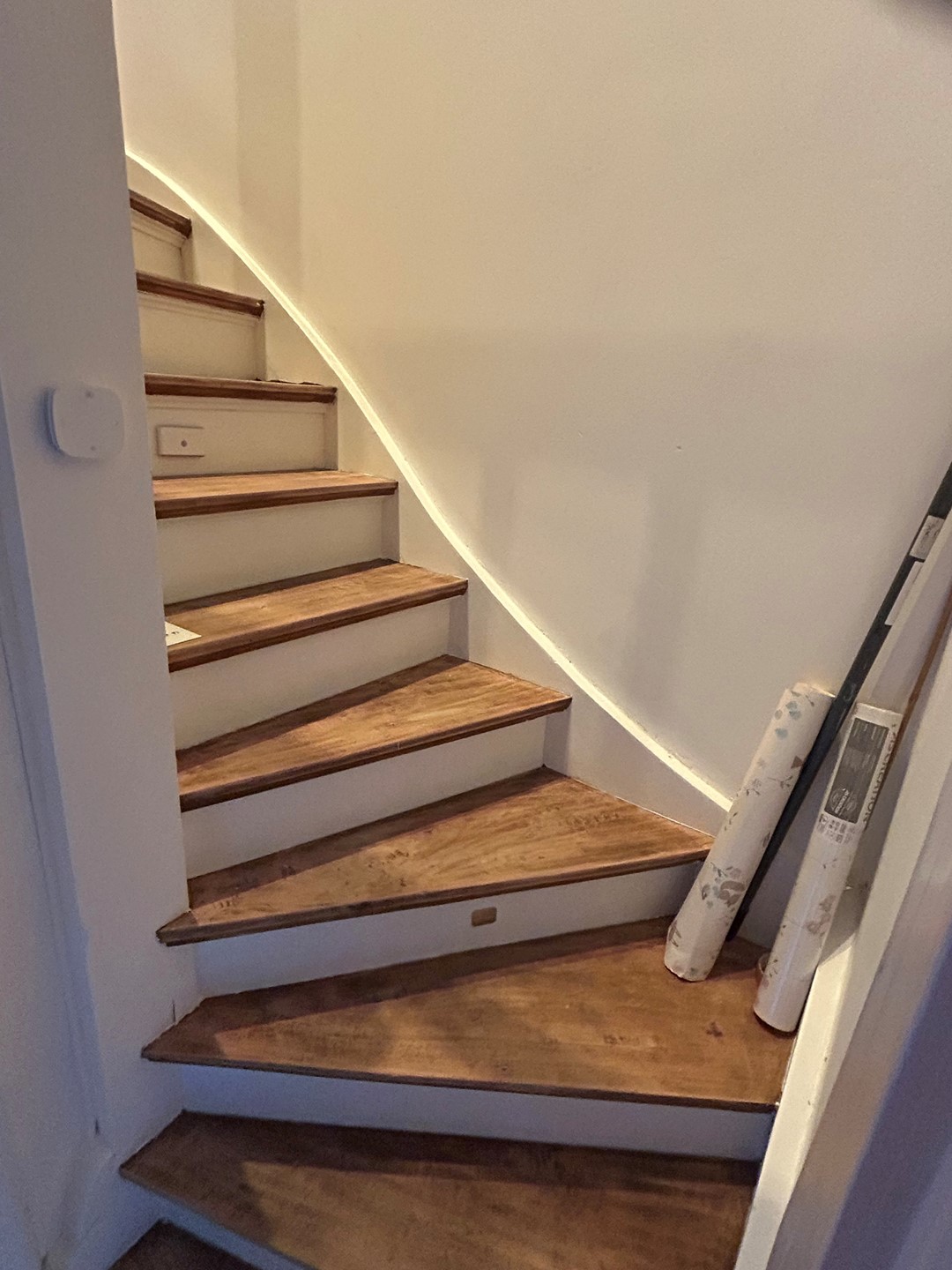 Overloop 3,60 x 1,50/1,10 met laminaatvloer en vaste trap naar tweede verdieping.
