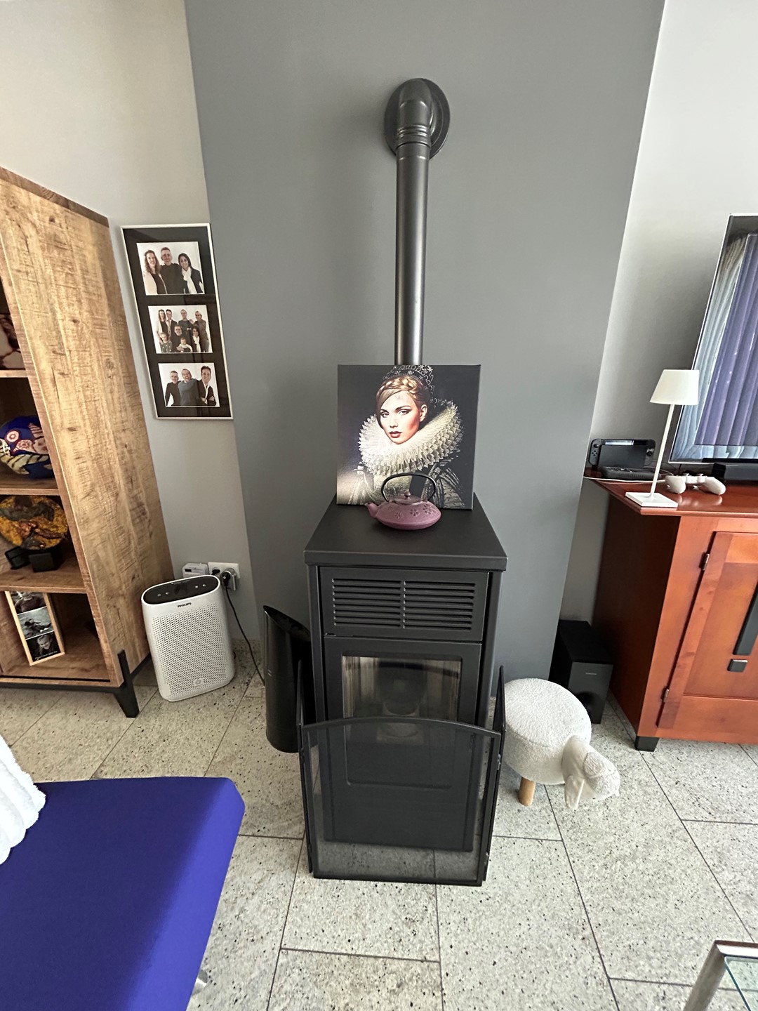 Woonkamer 8,15 x 3,75 met granieten vloer, pelletkachel, airco, schuifpui naar achtertuin en open keuken.