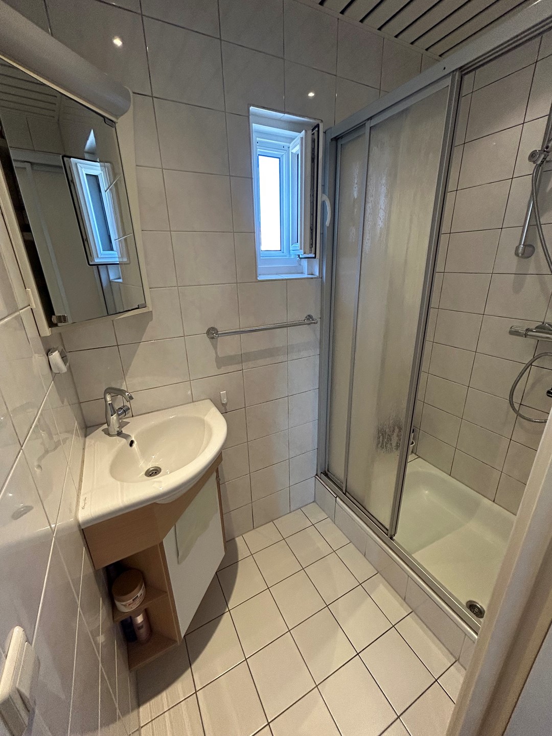 Badkamer 1,85 x 1,10 met plavuizenvloer, inbouwspots, douche met cabine, badkamermeubel met wastafel.