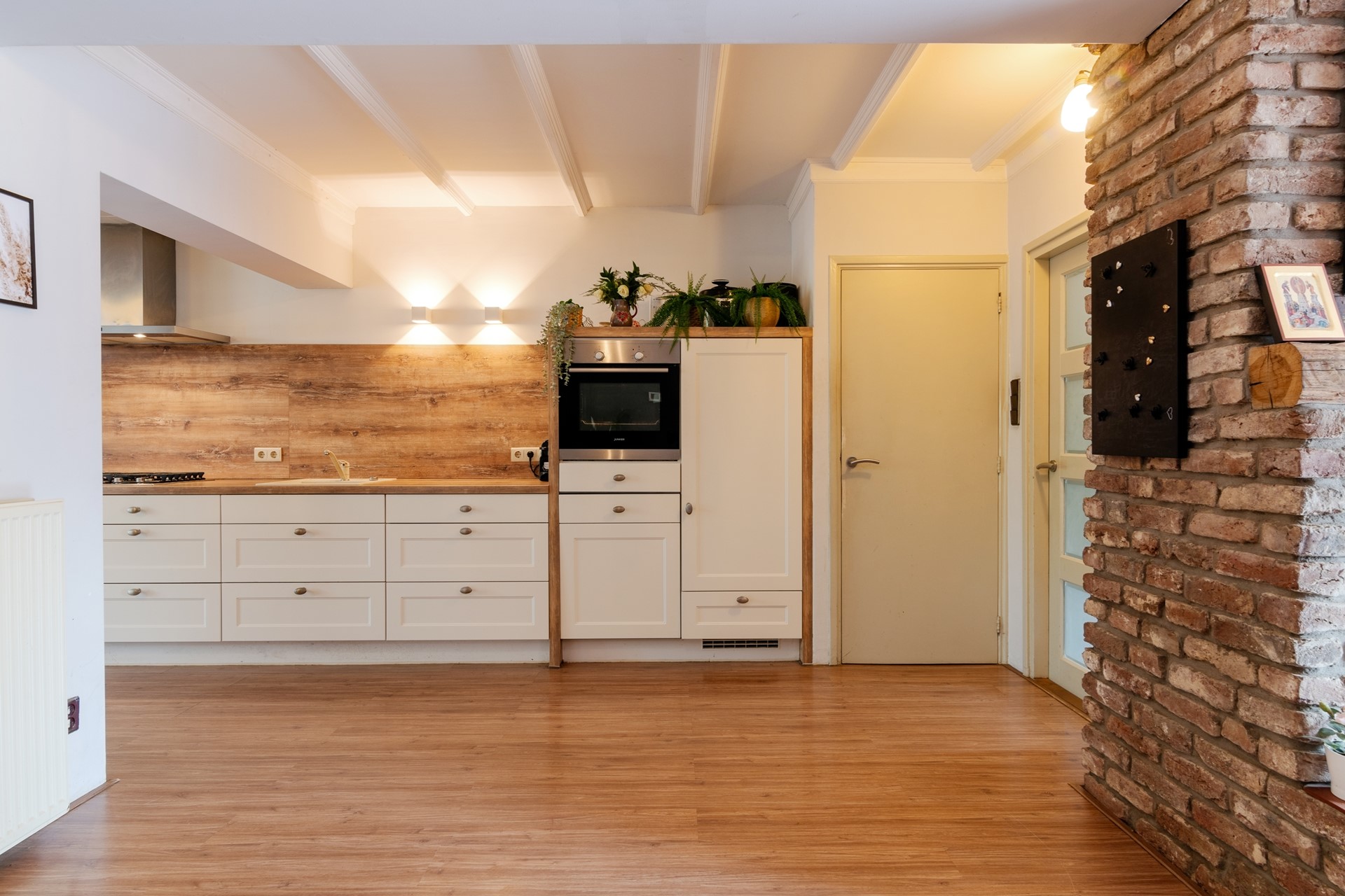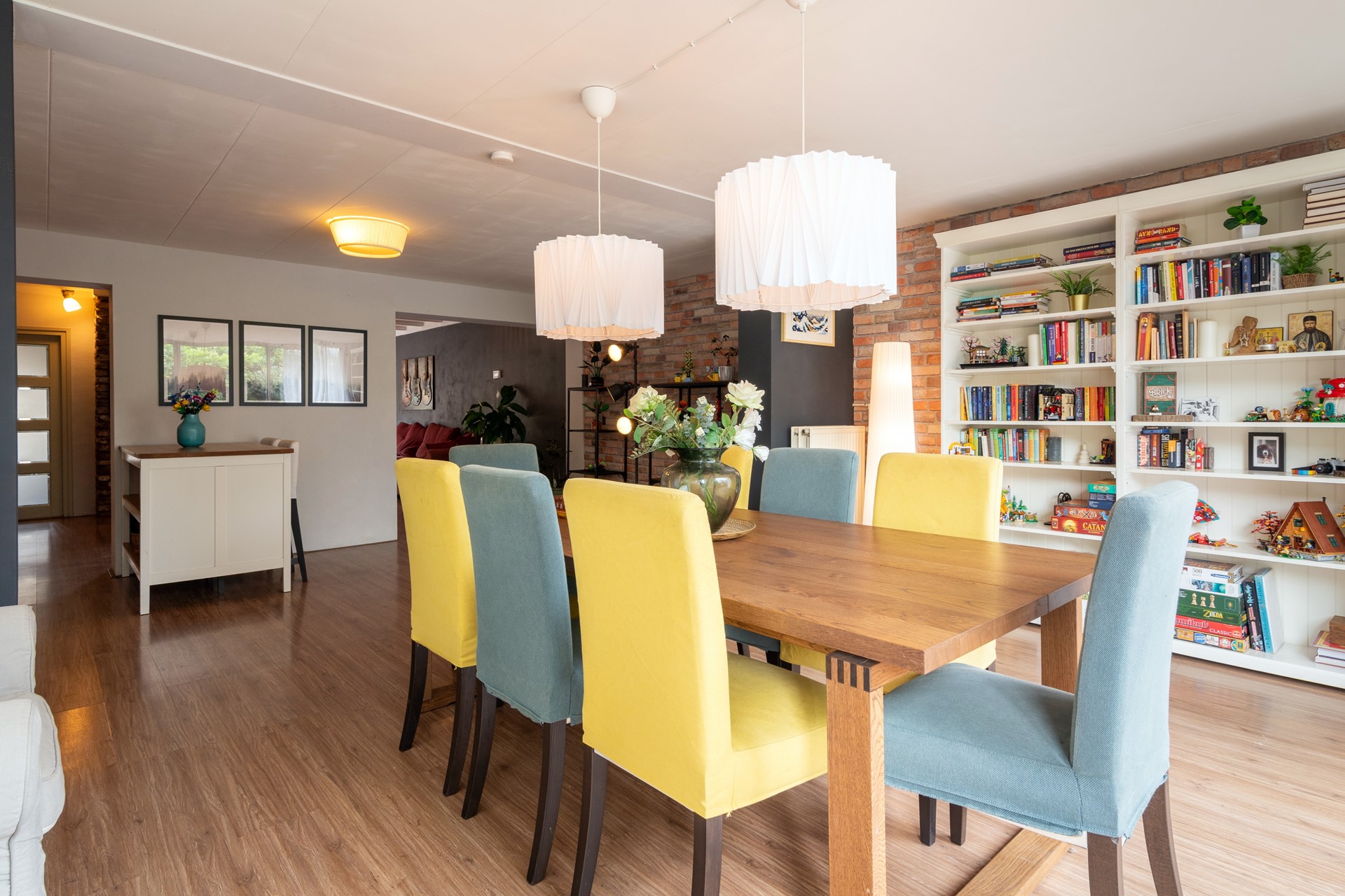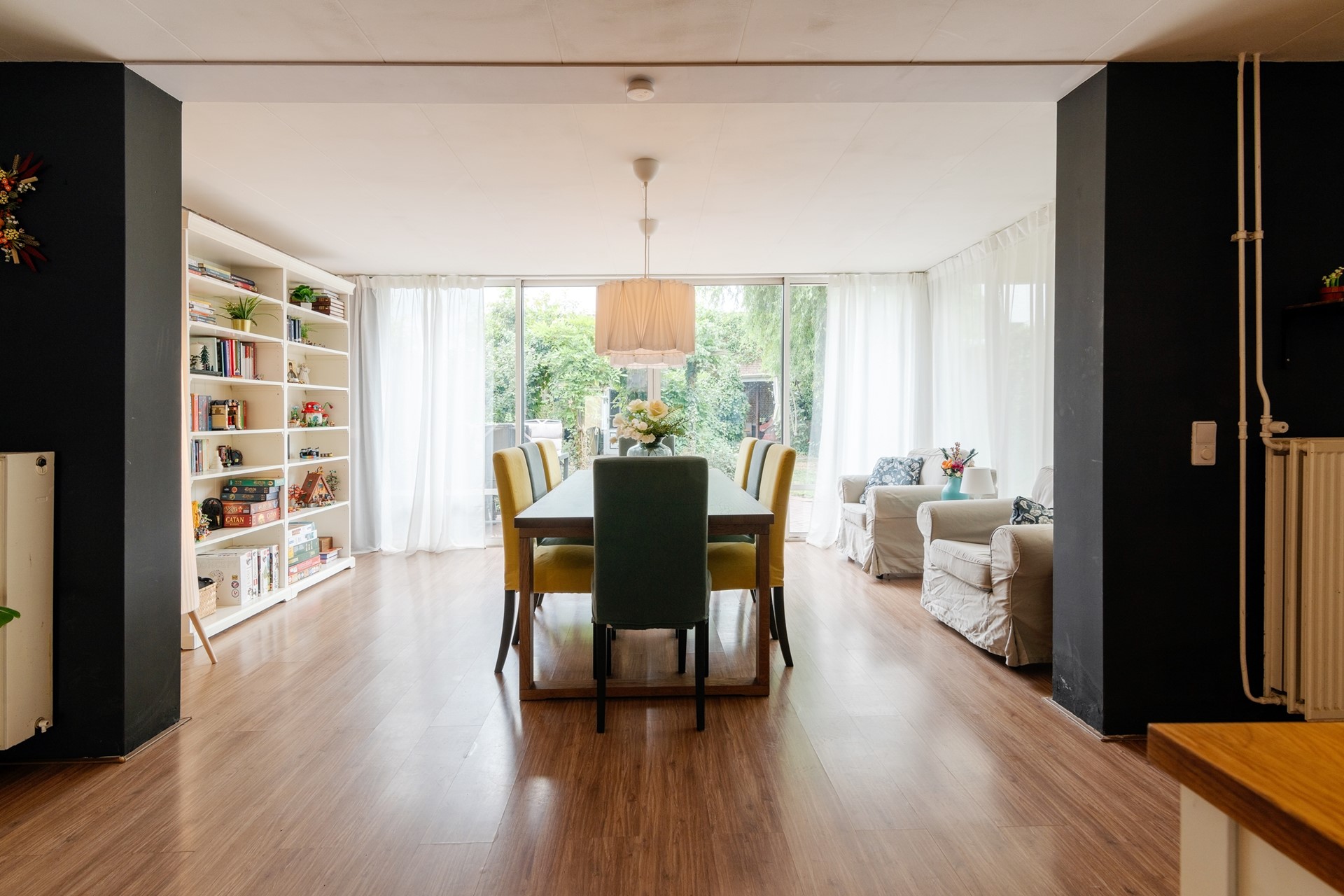 De woonkamer is ruim en sfeervol, met een open haard en een handige inbouwkast. Dankzij de rolluiken houdt u eenvoudig de zon buiten. De ruimte loopt door in de royale aanbouw die momenteel dienstdoet als eetkamer. Hier zorgen de grote schuifpui en het zicht op de tuin voor een lichte en open sfeer.