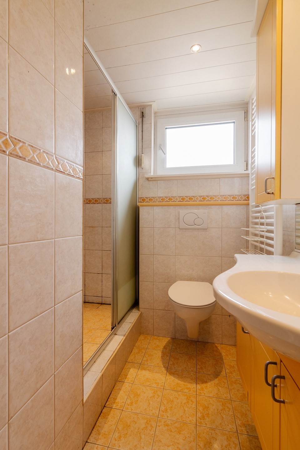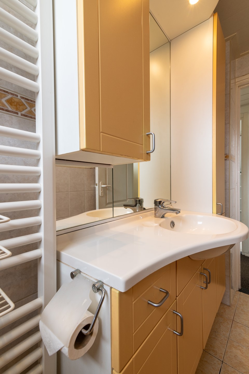 De badkamer is netjes en functioneel ingedeeld met een douchecabine, een badkamermeubel met wastafel en spiegel, een toilet en een designradiator. Ook hier is een rolluik aanwezig.