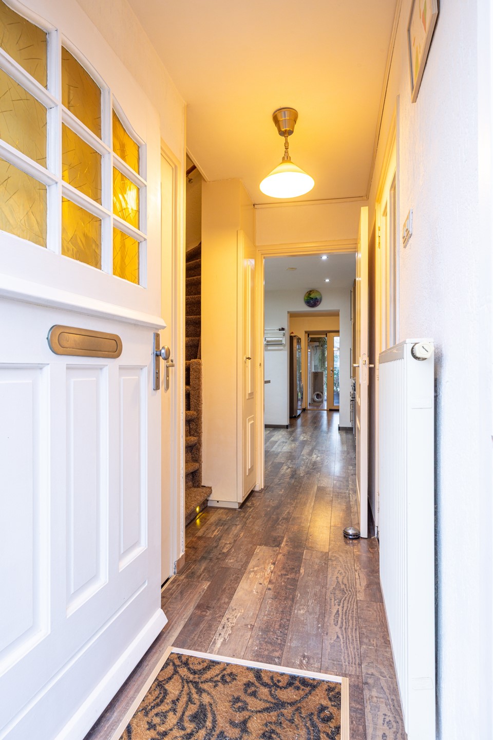 Bij aankomst valt direct de nette voortuin op, die zorgt voor een verzorgde en uitnodigende eerste indruk. Via de voordeur kom je in de ontvangsthal, welke is afgewerkt met een laminaatvloer. Vanuit hier zijn de verschillende ruimtes op de begane grond toegankelijk. In de hal bevinden zich de meterkast en het toilet. Het toilet is uitgevoerd met een zwevend closet, een fonteintje en een raam, wat zorgt voor natuurlijke ventilatie en daglicht.