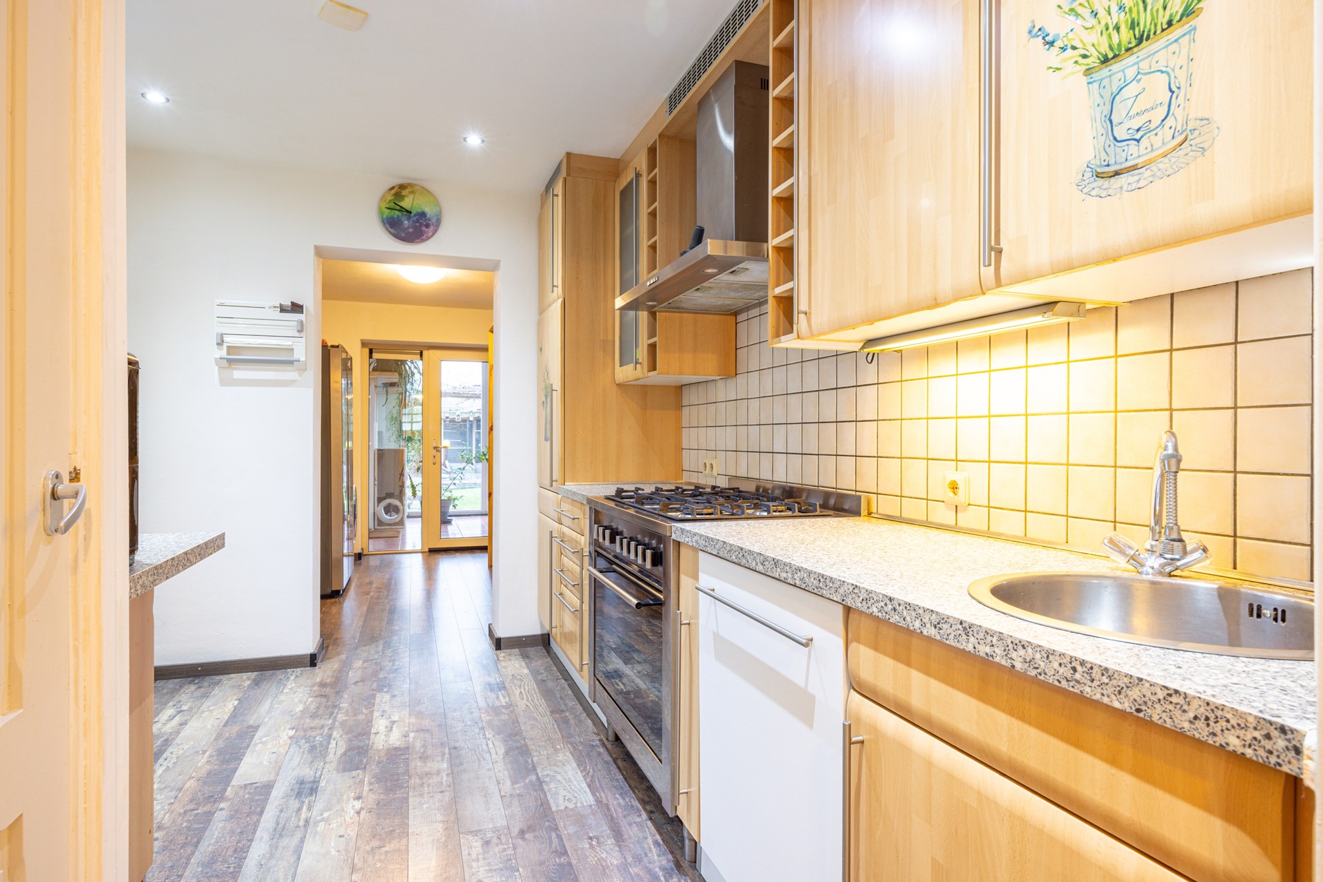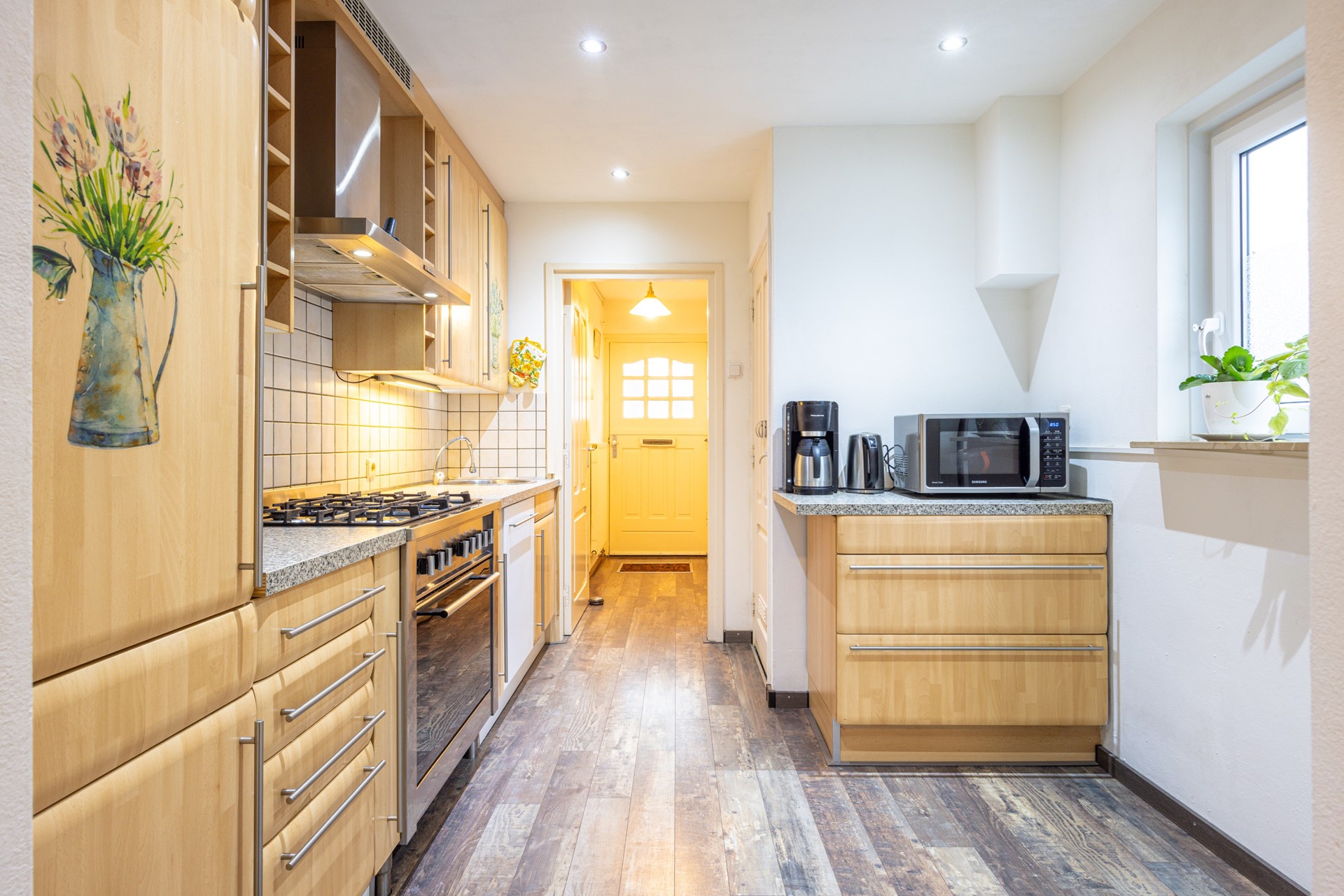 De halfopen keuken sluit mooi aan op zowel de hal als de woonkamer en is afgewerkt met dezelfde laminaatvloer, waardoor er een rustig en samenhangend geheel ontstaat. De keuken beschikt over veel werk- en opbergruimte en is voorzien van diverse inbouwapparatuur, waaronder een 5-pits gasfornuis met afzuigkap, een combi heteluchtoven, een koelkast en een vaatwasser. Hierdoor is de keuken prettig in gebruik en blijft er tijdens het koken eenvoudig contact met de leefruimte.