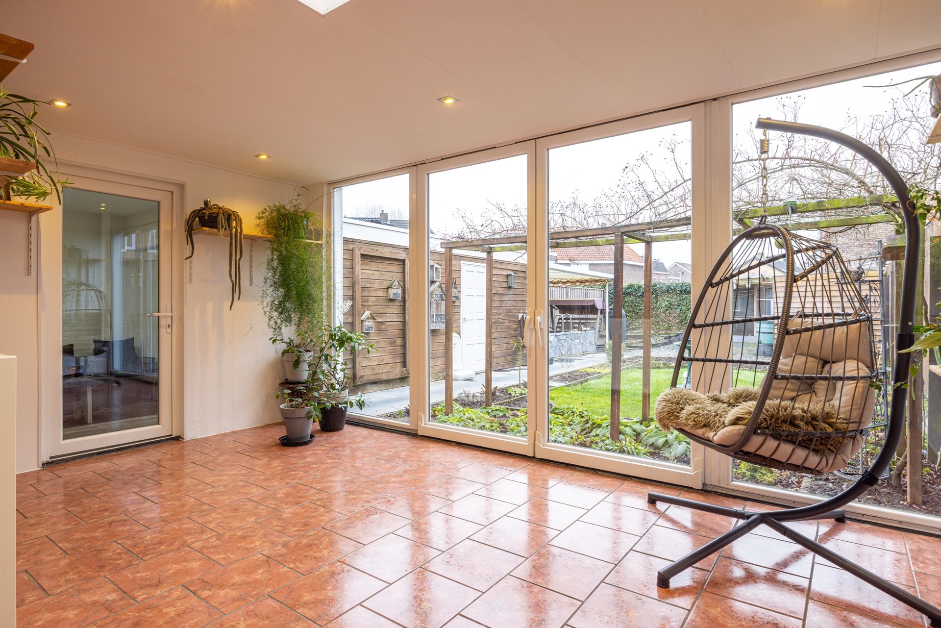 Aan de achterzijde van de woning bevindt zich de extra ruimte die als tuinkamer in gebruik is. Deze ruimte is via grote schuifpuien volledig te openen, waardoor er in de zomermaanden een open en directe verbinding met de tuin ontstaat. De tuinkamer vormt daarmee een waardevolle verlenging van de woonruimte en is geschikt om vrijwel het hele jaar door van te genieten.