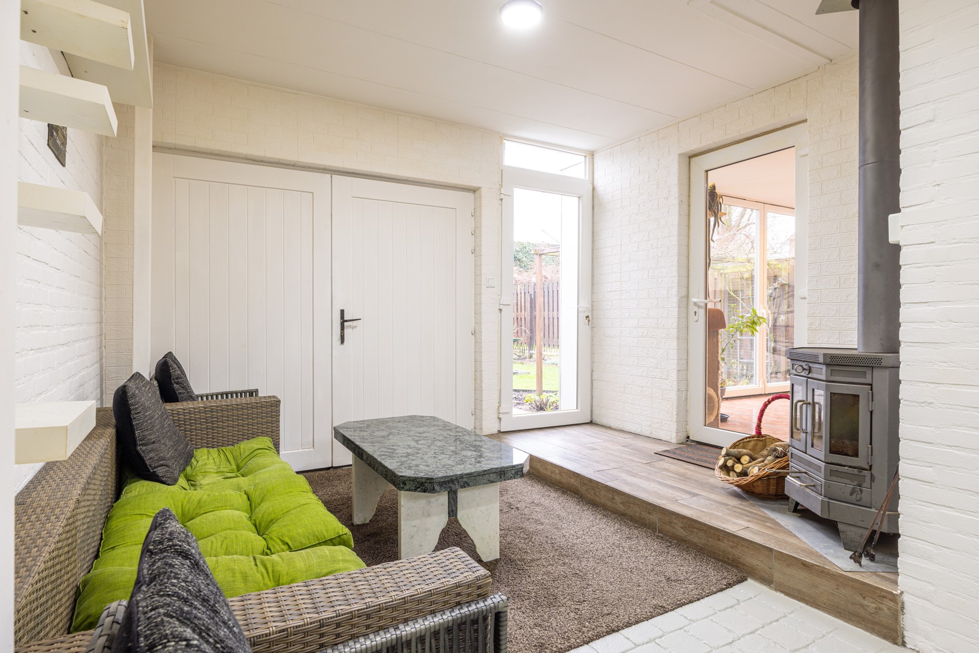 Vanuit de aanbouw is er tevens toegang tot de inpandige garage. Deze ruimte wordt momenteel gebruikt als extra zitkamer en is voorzien van een houtkachel, wat bijdraagt aan een aangename en warme sfeer. Het voorste gedeelte van de garage beschikt daarnaast over een eigen toegang tot de achtertuin, wat zorgt voor extra gemak en een goede verbinding tussen binnen en buiten.