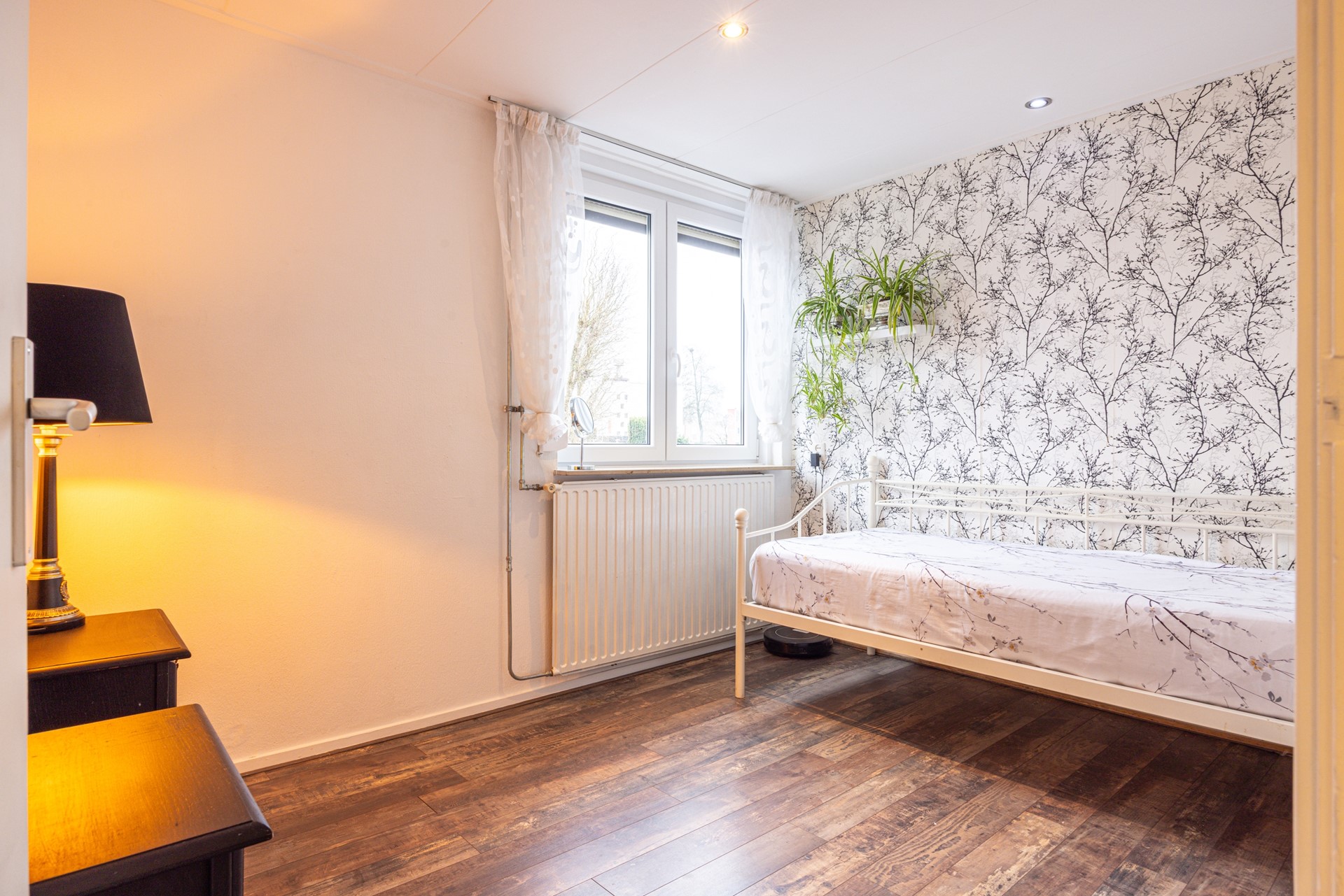 Via de trap bereik je de eerste verdieping. De overloop is afgewerkt met vloerbedekking en biedt toegang tot drie kamers en de badkamer. Twee van deze kamers zijn ingericht als slaapkamer en zijn afgewerkt met een laminaatvloer. Beide kamers beschikken over veel daglicht en zijn voorzien van rolluiken, wat zorgt voor extra comfort. Eén slaapkamer is uitgerust met houten kozijnen met dubbel glas, terwijl de andere slaapkamer beschikt over kunststof kozijnen met HR++ beglazing. De kamers zijn prettig van formaat en lenen zich uitstekend voor gebruik als slaap-, werk- of hobbykamer. De derde kamer op deze verdieping is momenteel ingericht als inloopkast en biedt veel opbergruimte. Deze ruimte kan desgewenst ook worden aangepast voor een andere invulling, afhankelijk van de woonwensen. De badkamer is compleet uitgevoerd en afgewerkt met een tegelvloer. Ook hier is aan comfort gedacht dankzij de kunststof kozijnen met HR++ glas en het aanwezige rolluik. De ruimte is ingericht met een inloopdouche en een jacuzzi met warmtepomp, voorzien van verlichting en radio. Daarnaast beschikt de badkamer over een badkamermeubel met spiegel en verlichting, een zwevend toilet en een designradiator.
