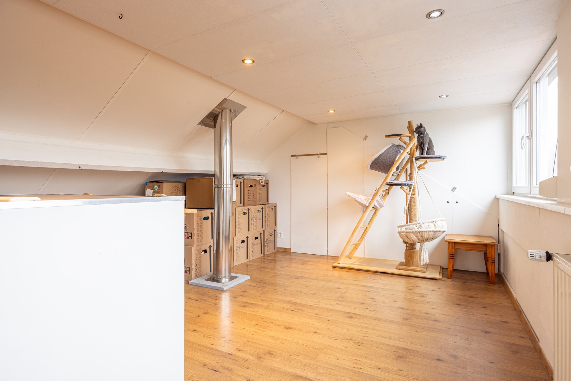 De tweede verdieping is bereikbaar via een vaste trap en vormt een volwaardige aanvulling op het woonoppervlak. Deze verdieping is afgewerkt met een laminaatvloer en voorzien van een dakkapel, waardoor er veel daglicht binnenvalt. De ruimte is uitstekend geschikt als derde slaapkamer, werkkamer of hobbyruimte en biedt daarmee extra flexibiliteit binnen de woning.