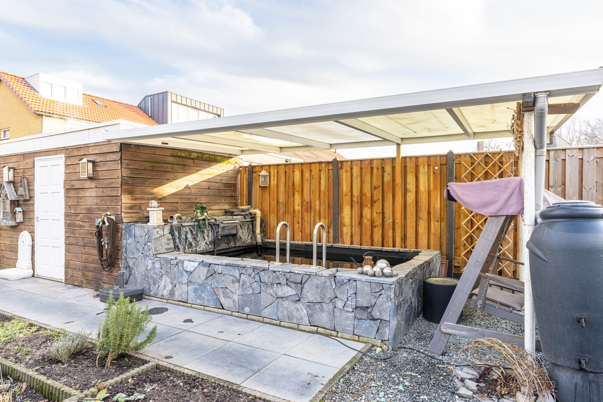 In de tuin is een klein zwembad (200 cm x 321 cm x 160 diep) geplaatst. Bij het zwembad bevindt zich een overkapping, waardoor je hier ook bij wisselende weersomstandigheden prettig kunt verblijven. Het zwembad zorgt op warme dagen voor extra plezier voor jong en oud. De groene invulling van de tuin geeft de buitenruimte een verzorgde uitstraling en biedt voldoende privacy. Verder beschikt de tuin over een tuinhuis dat is voorzien van elektra en geschikt is voor het opbergen van tuingereedschap, fietsen en andere spullen.
