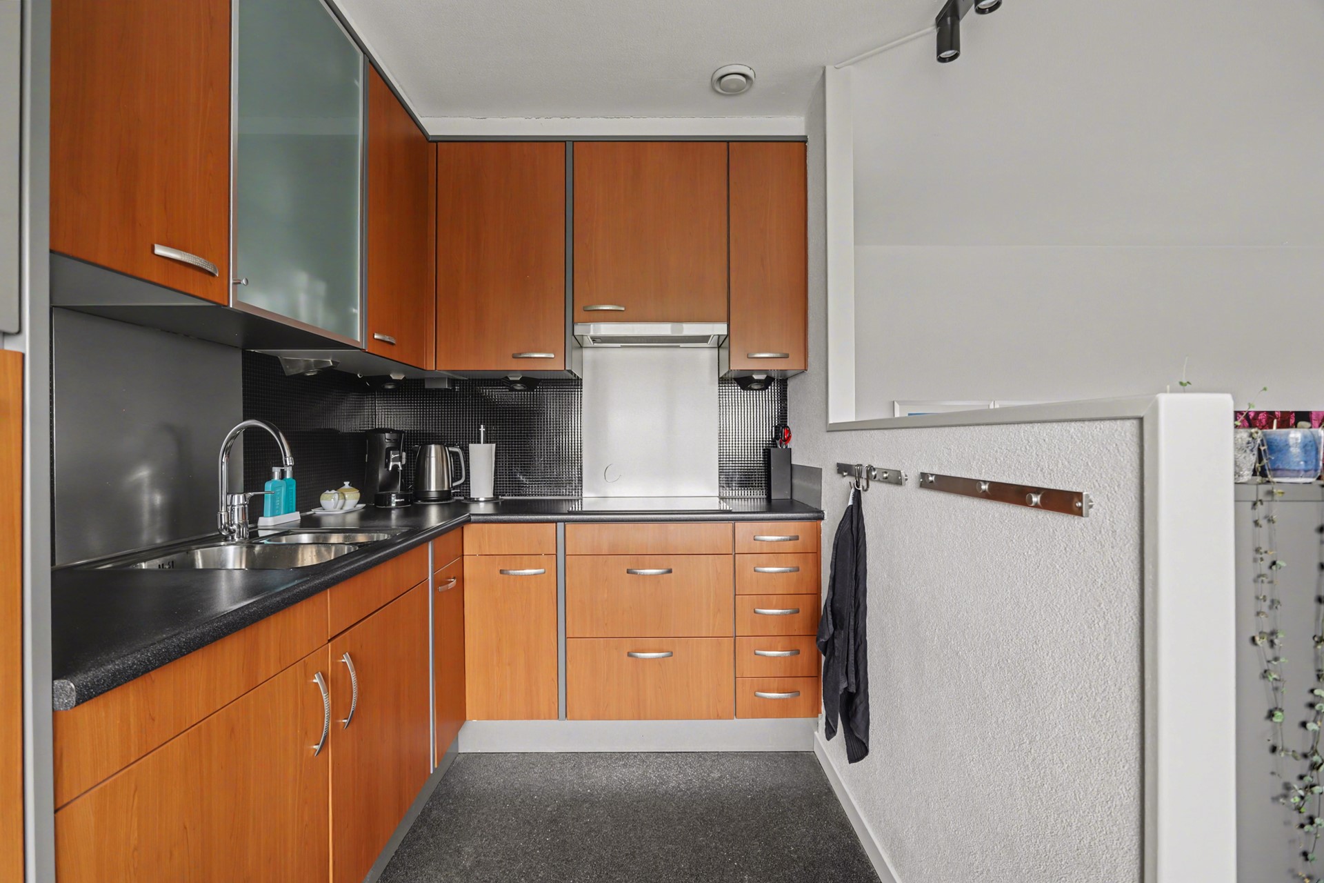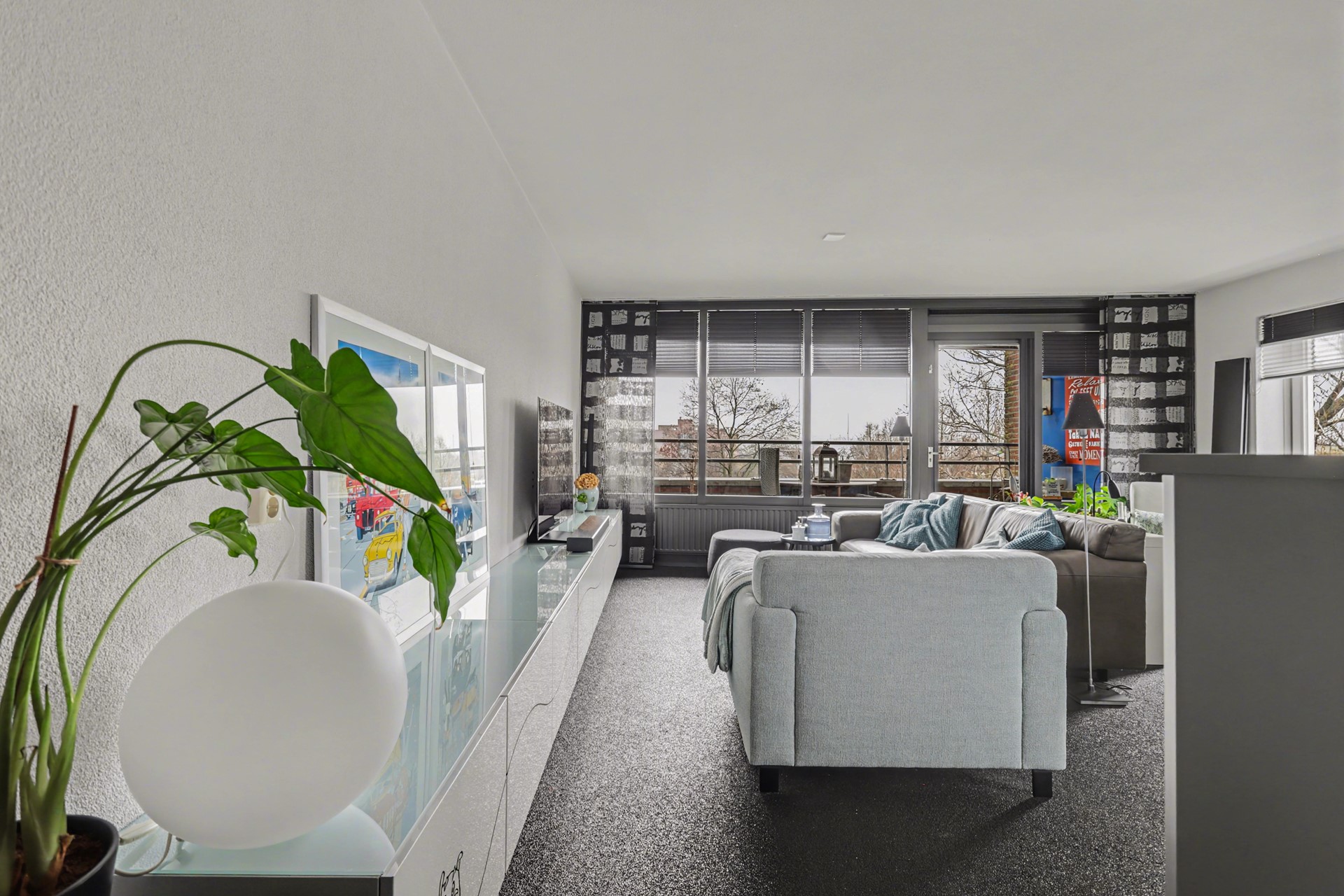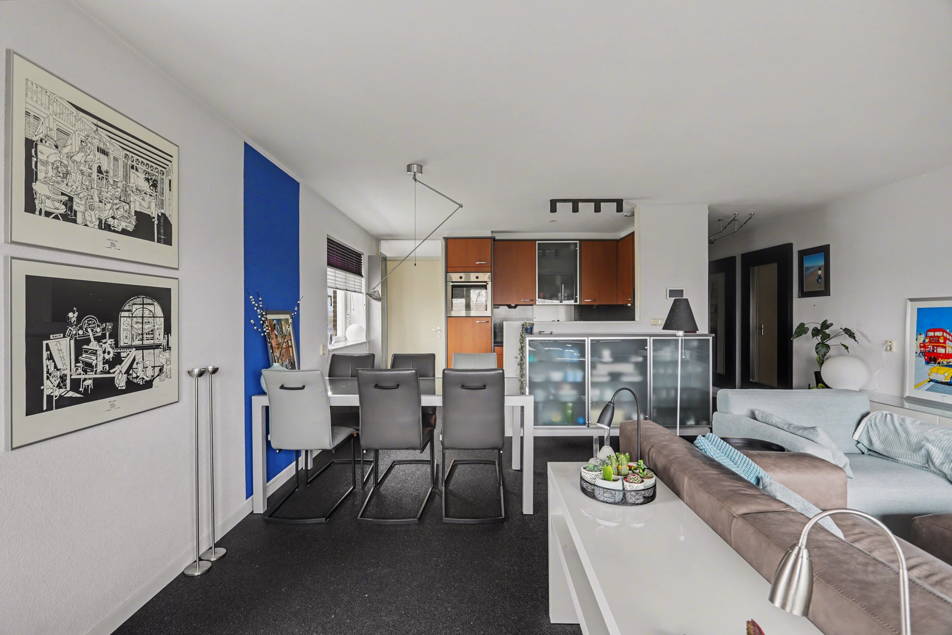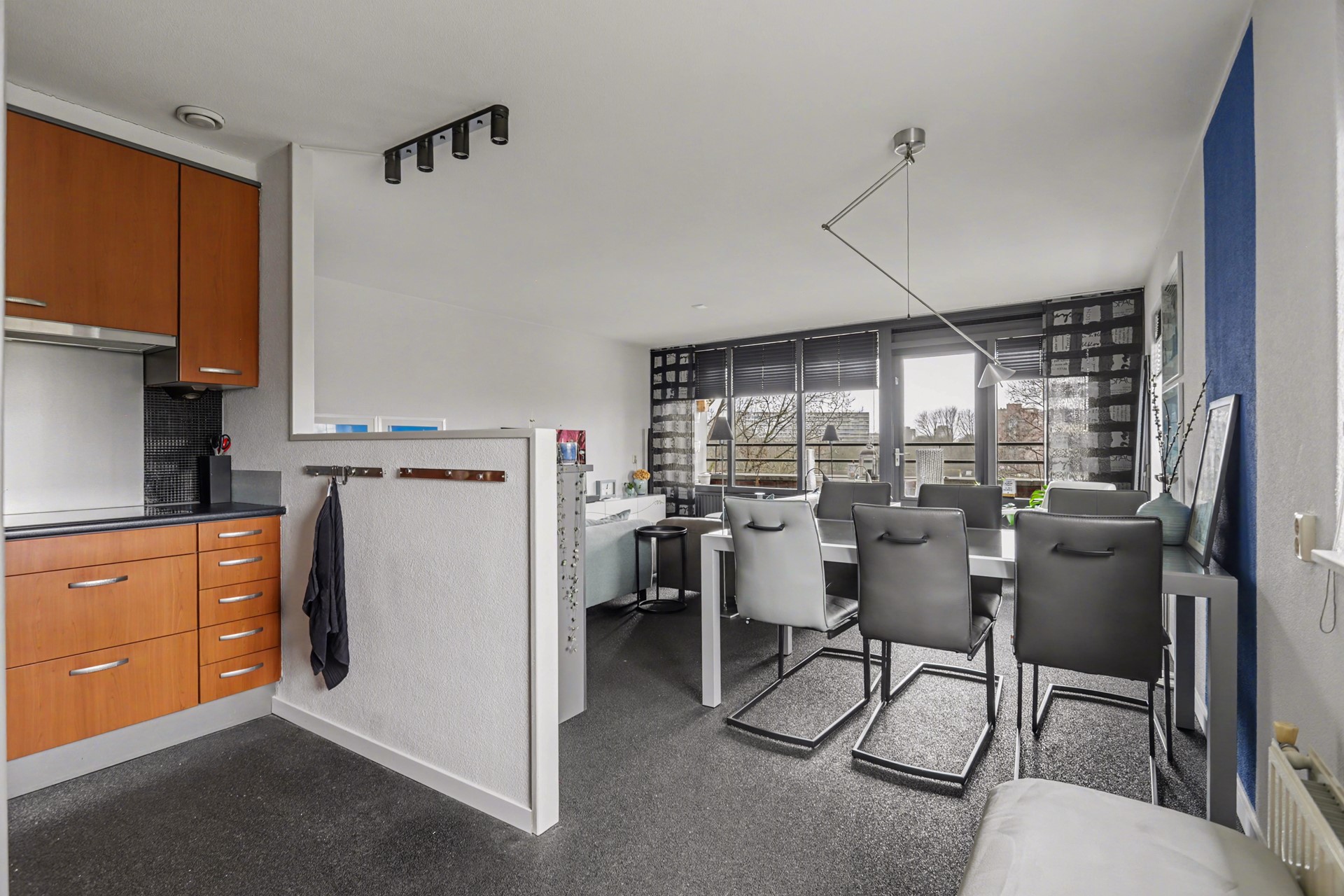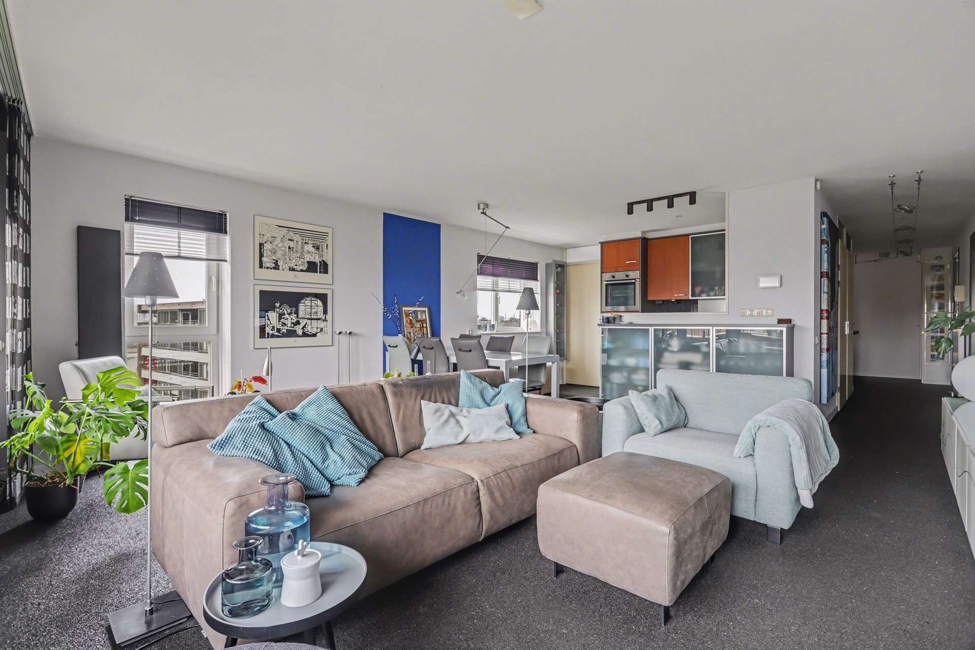 De woonkamer en keuken zijn samen 34 m² groot en zijn - door de grote raampartijen en de hoekligging - gezegend met een hoge mate van lichtinval.