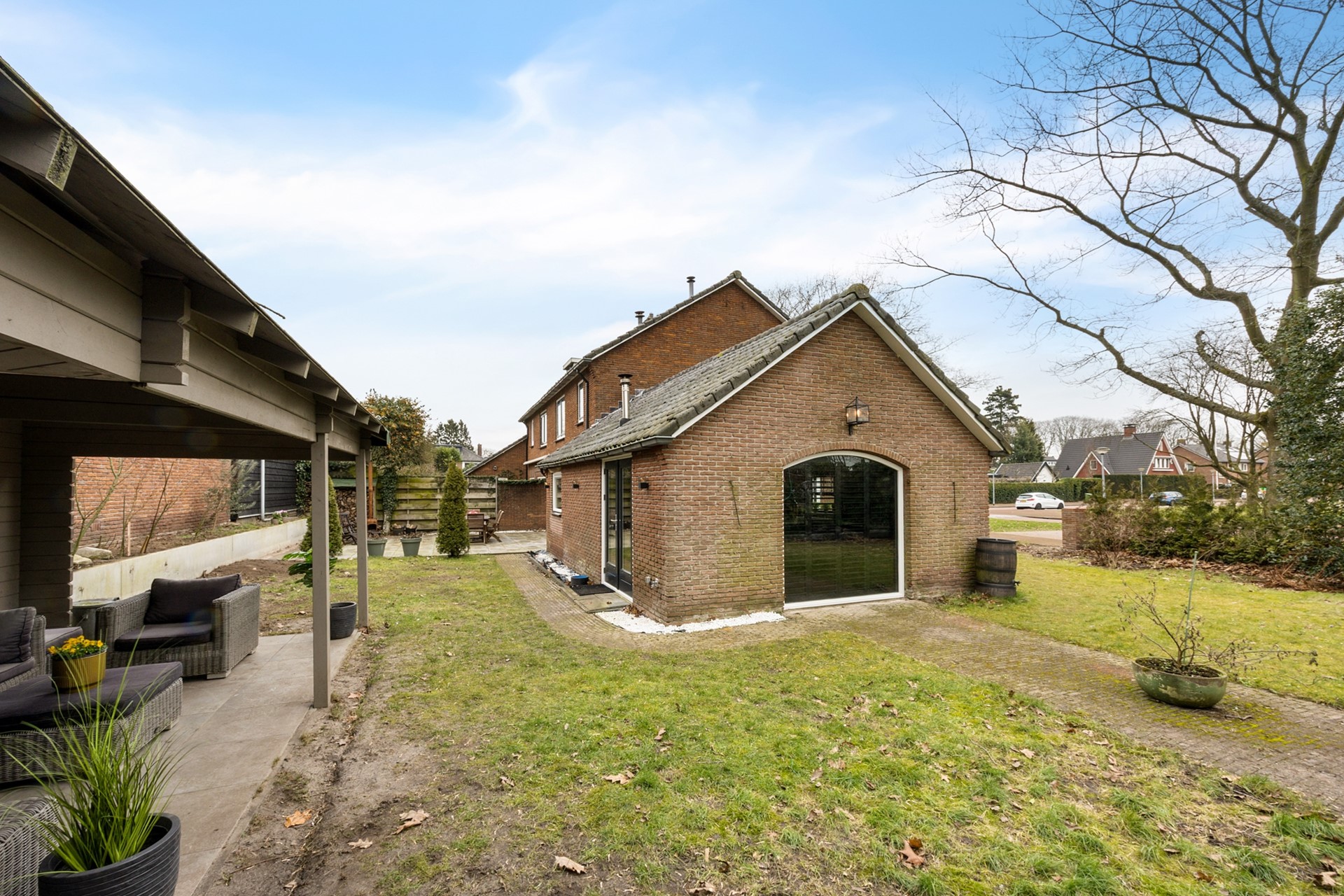 De zeer ruime tuin is een heerlijke plek om te ontspannen. Dankzij de verschillende mogelijkheden voor zithoeken kunt u zowel van de zon als van een verkoelend plekje in de schaduw genieten. Daarnaast beschikt de woning over parkeergelegenheid op eigen terrein.
