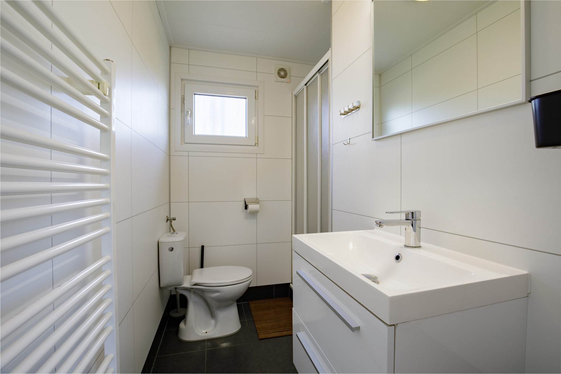 • Badkamer met toilet, inloopdouche en wastafel meubel