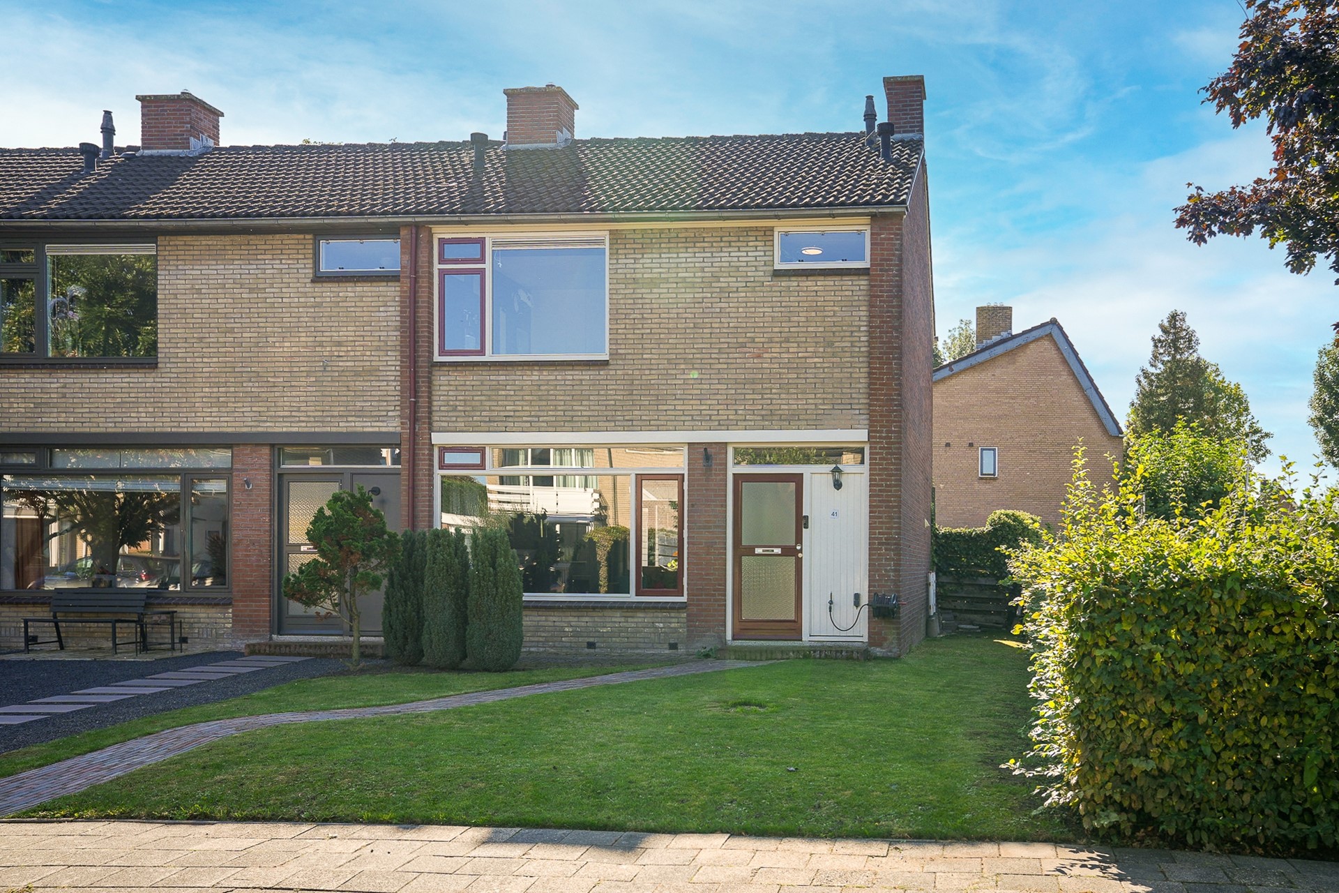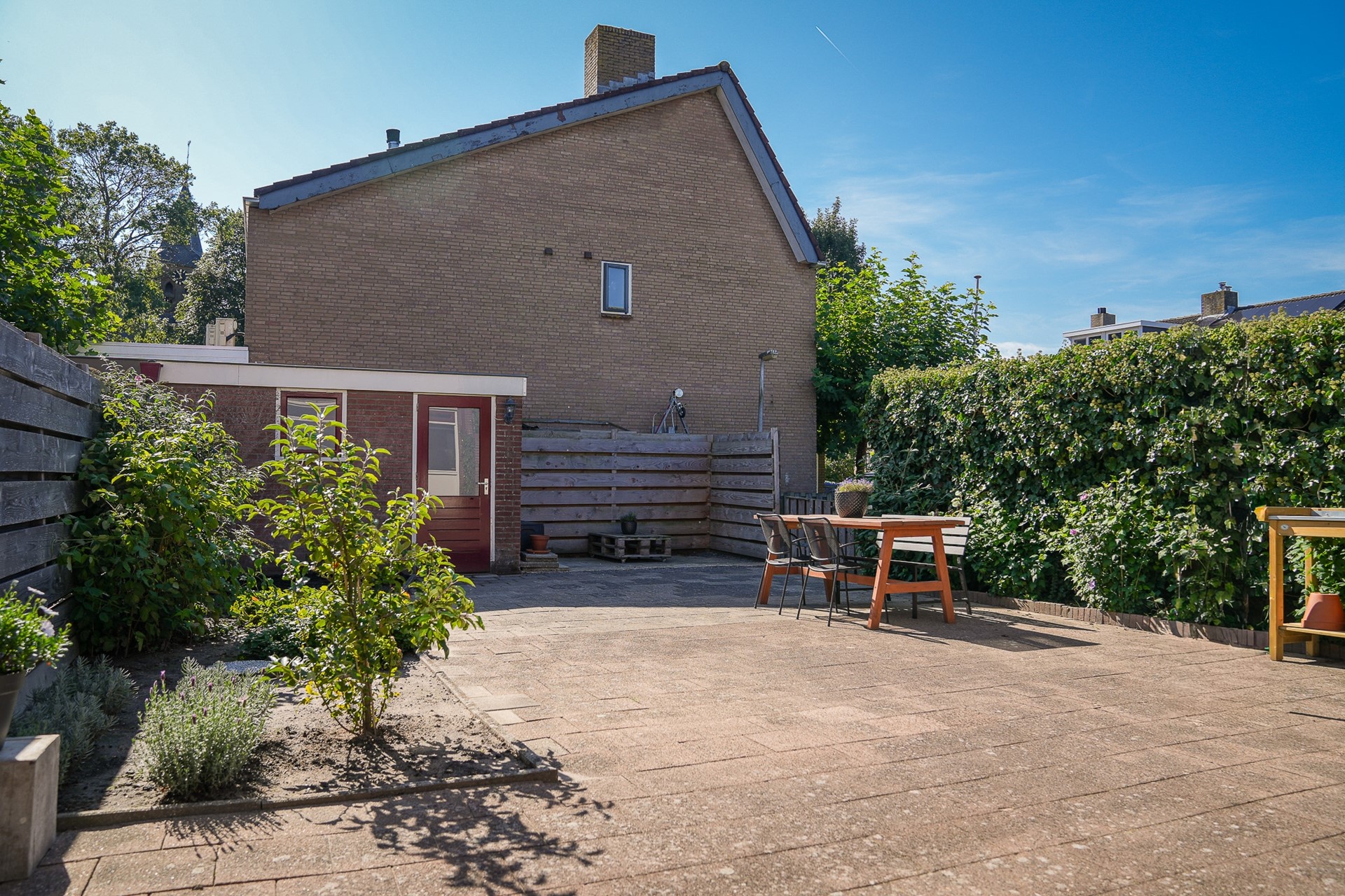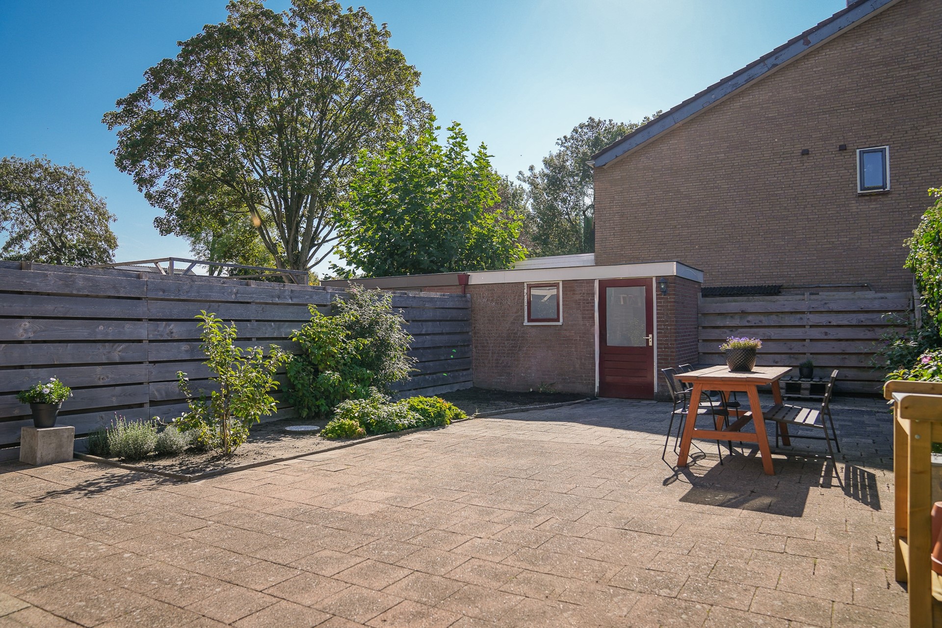 De achtertuin ligt gunstig op het zuidoosten en biedt volop privacy. Je vindt hier een betegeld terras, een vrijstaande berging en genoeg ruimte om desgewenst een overkapping te plaatsen. Aan de achtergevel hangt een handbediend zonnescherm. De tuin is bereikbaar via een achterom en is grotendeels onderhoudsvriendelijk aangelegd. Aan de voorzijde van de woning ligt een verzorgde voortuin met een gazon, een border en een looppad naar de voordeur.