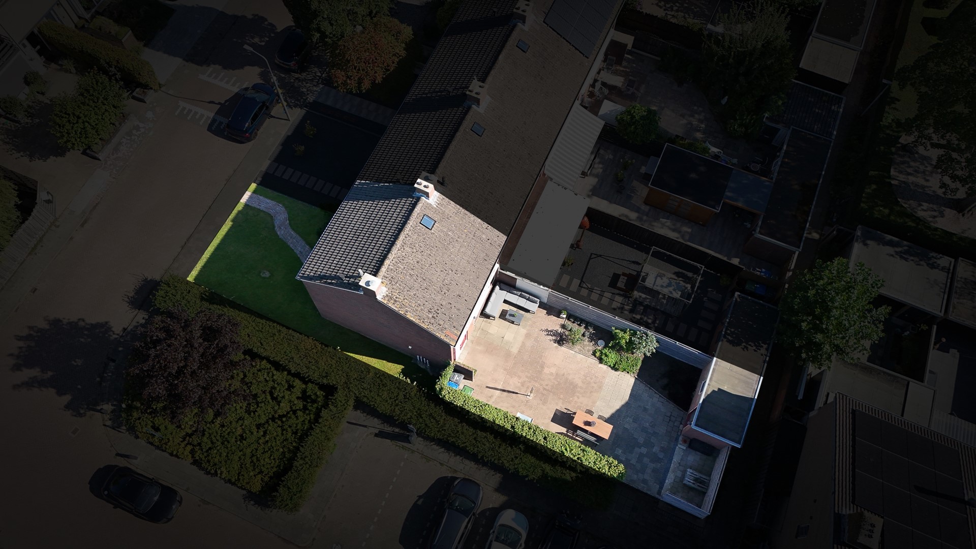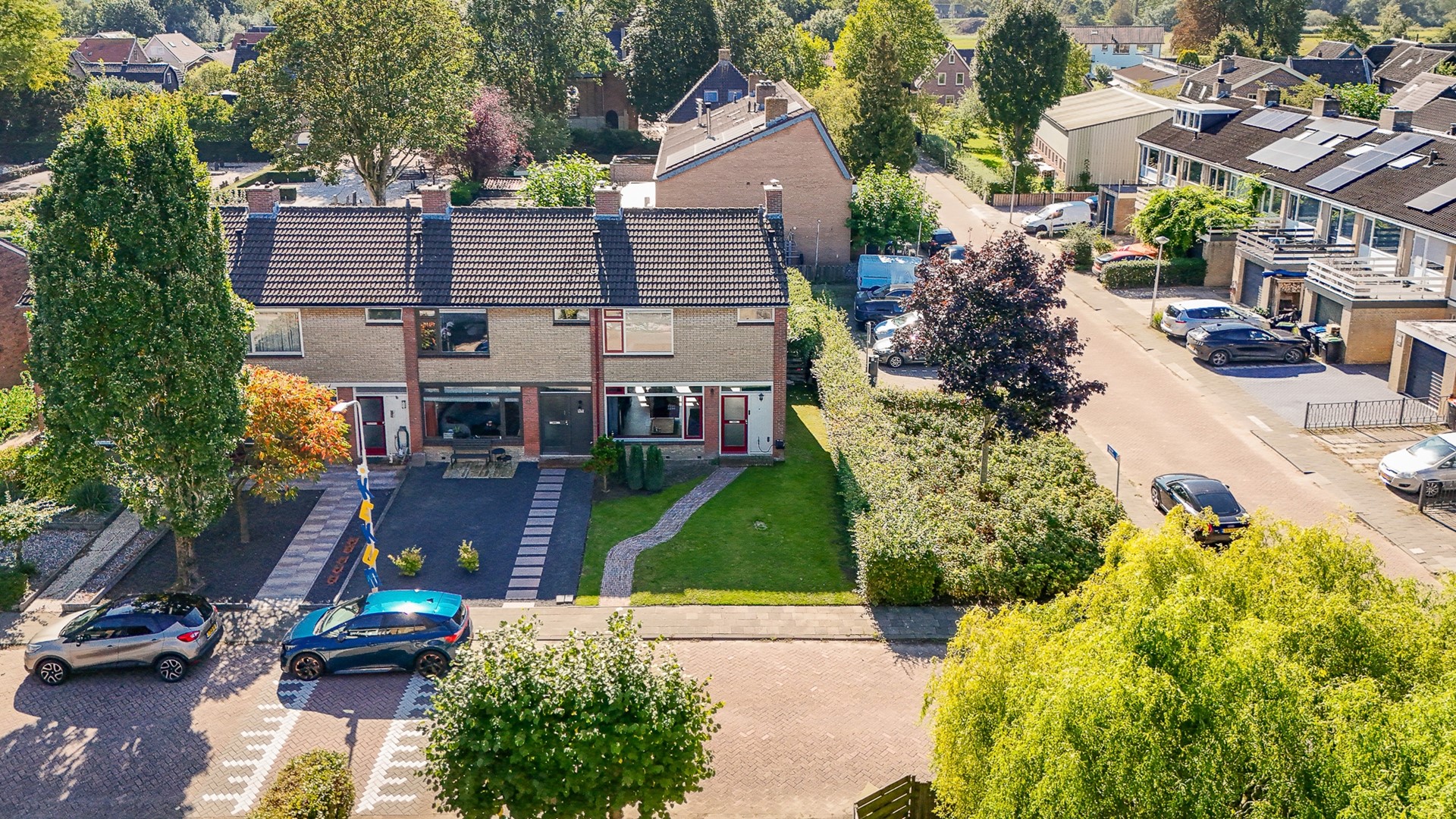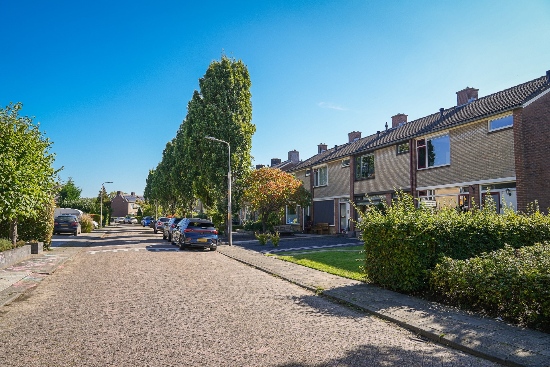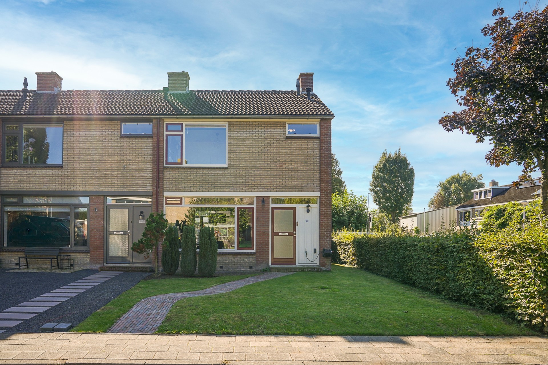 De achtertuin ligt gunstig op het zuidoosten en biedt volop privacy. Je vindt hier een betegeld terras, een vrijstaande berging en genoeg ruimte om desgewenst een overkapping te plaatsen. Aan de achtergevel hangt een handbediend zonnescherm. De tuin is bereikbaar via een achterom en is grotendeels onderhoudsvriendelijk aangelegd. Aan de voorzijde van de woning ligt een verzorgde voortuin met een gazon, een border en een looppad naar de voordeur.
