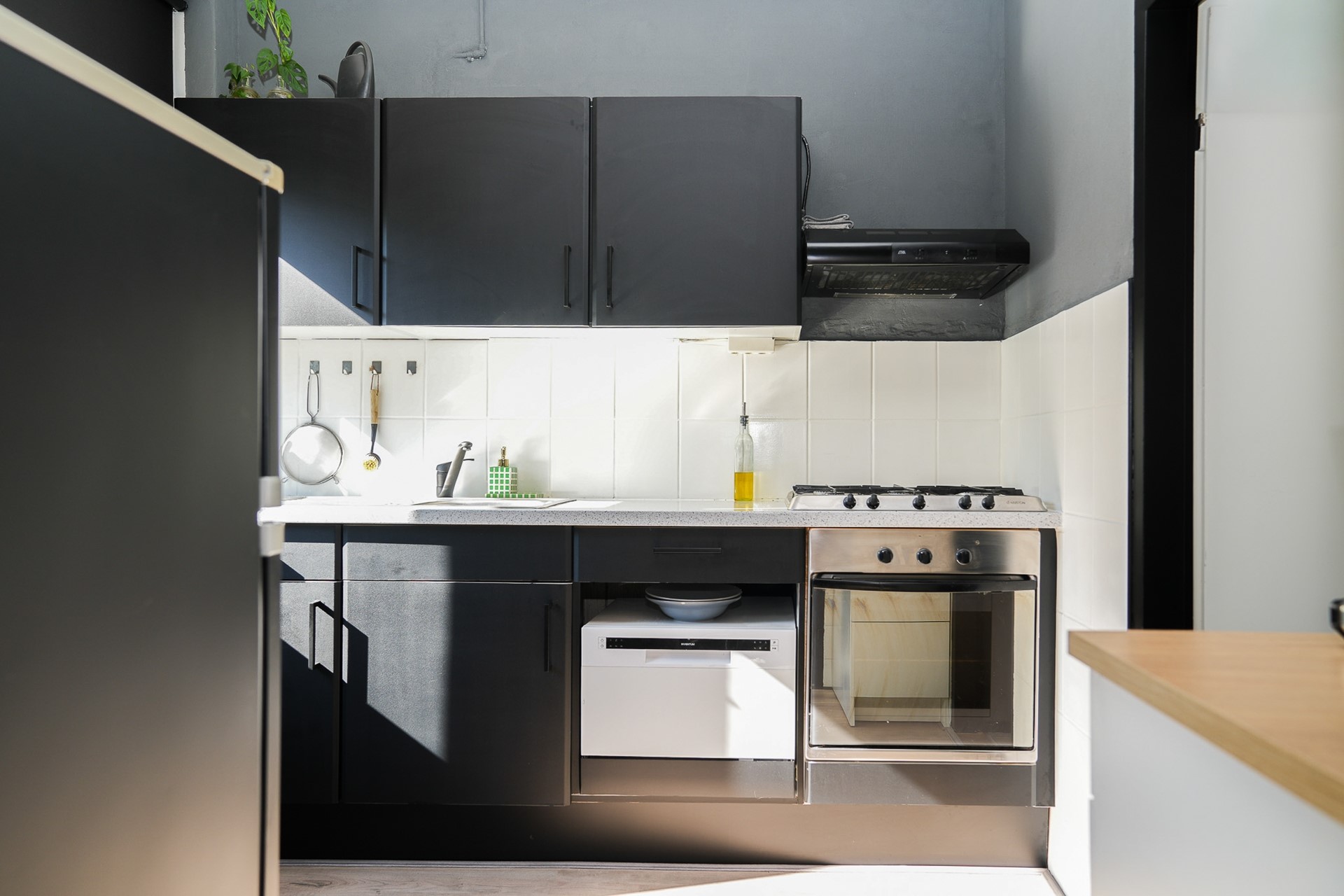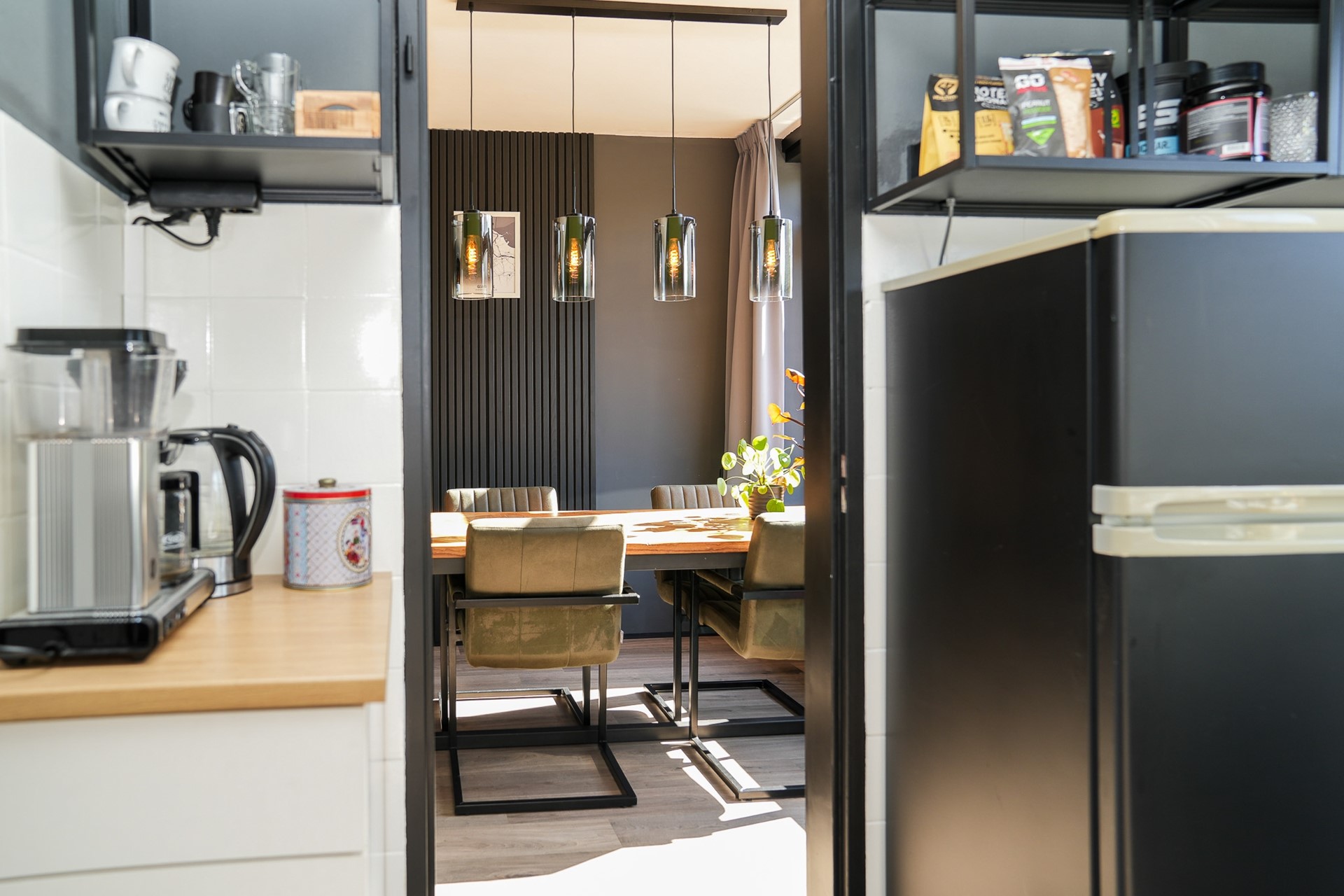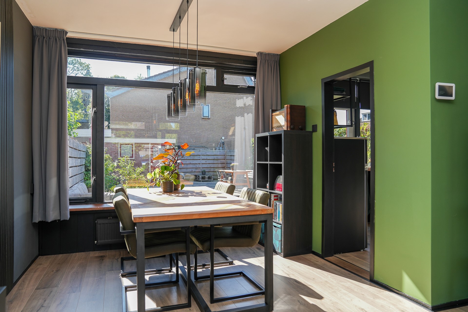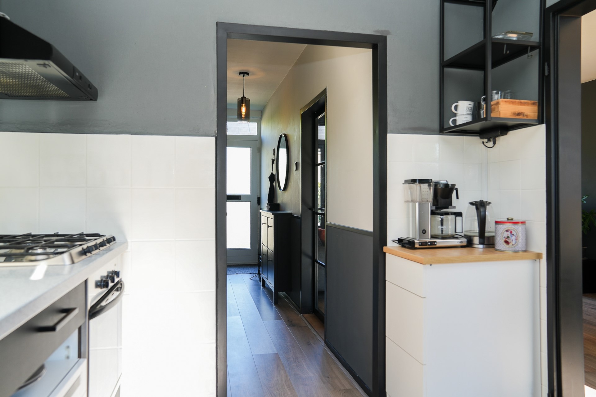 Aan de achterzijde is de keuken opengebroken richting de eetkamer. Dit geeft een heerlijk open gevoel en maakt de ruimte perfect voor het gezinsleven of etentjes met vrienden. De keuken is ingericht met een 5-pits gaskookplaat, oven, afzuigkap, koel- en vrieskast, en werkbladen aan beide zijden. Via de keukendeur stap je zo het terras en de tuin in.