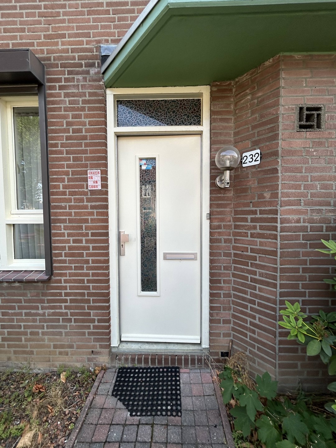 Houten kozijnen met beneden dubbele beglazing en boven enkele beglazing.