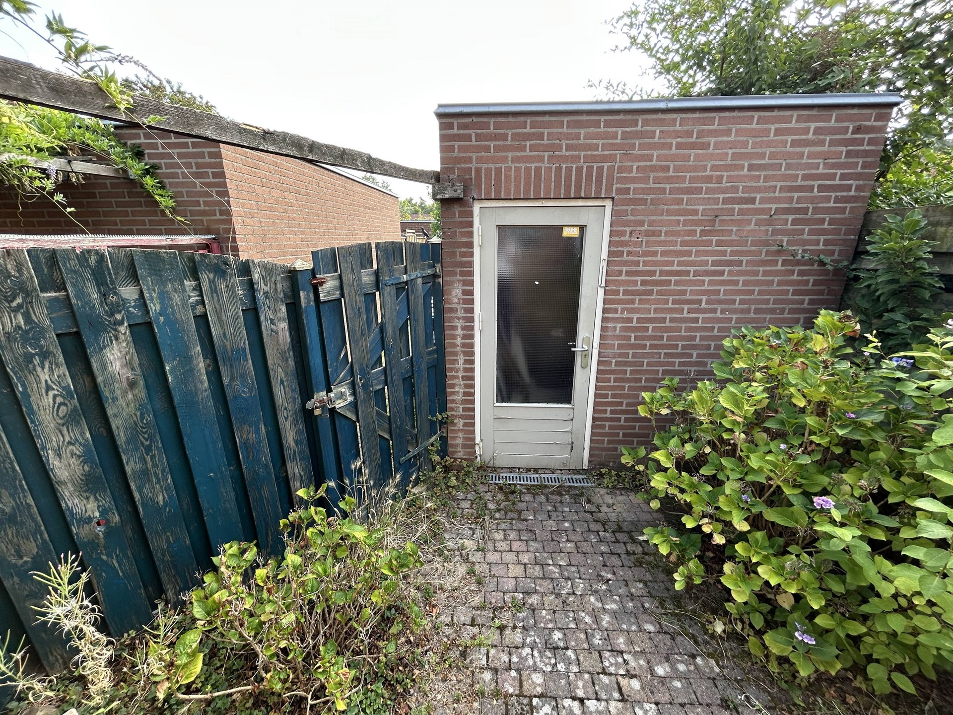 Achtertuin met terras, bestrating, beplanting, stenen berging 3,00 x 2,50 met elektriciteit, wateraansluiting en achteringang.