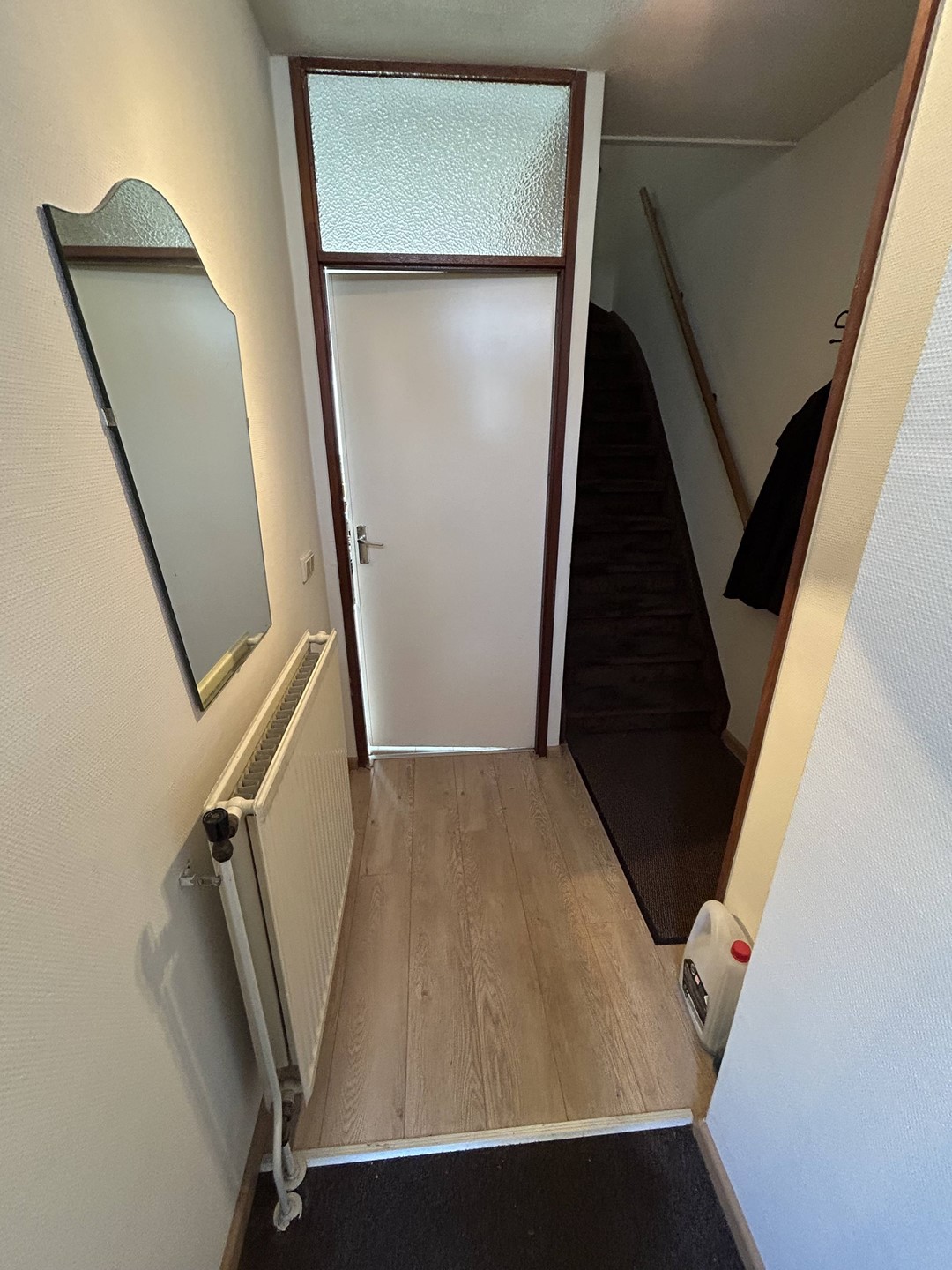Entree/gang 2,75 x 1,90/1,00 met laminaatvloer, nieuwe meterkast met slimme meters, gastentoilet 1,20 x 0,85 met duoblok en fonteintje, deur naar woonkamer en trap naar verdieping.
