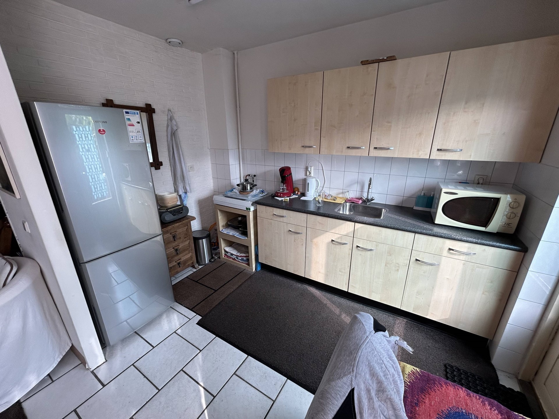 Keuken 3,15 x 2,20 met plavuizenvloer, deur naar achtertuin en keukenblok met spoelbak.