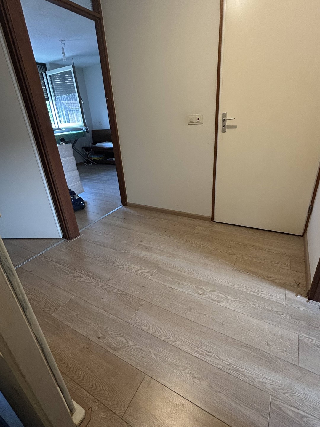 Overloop 2,10 x 1,95 met laminaatvloer en vlizotrap naar zolder.