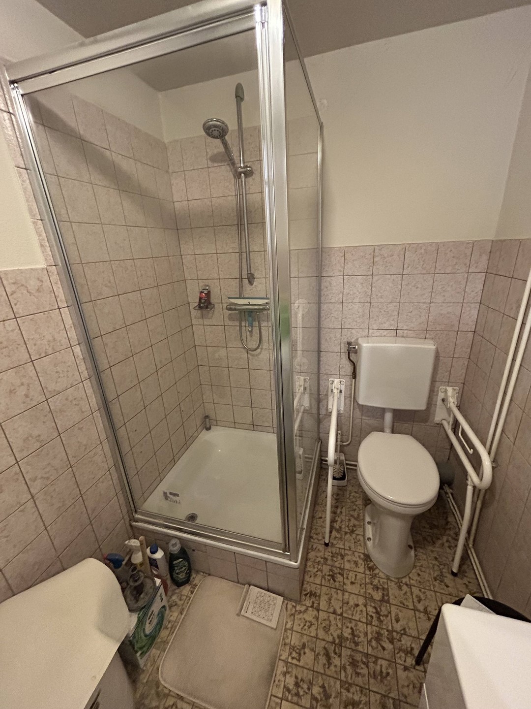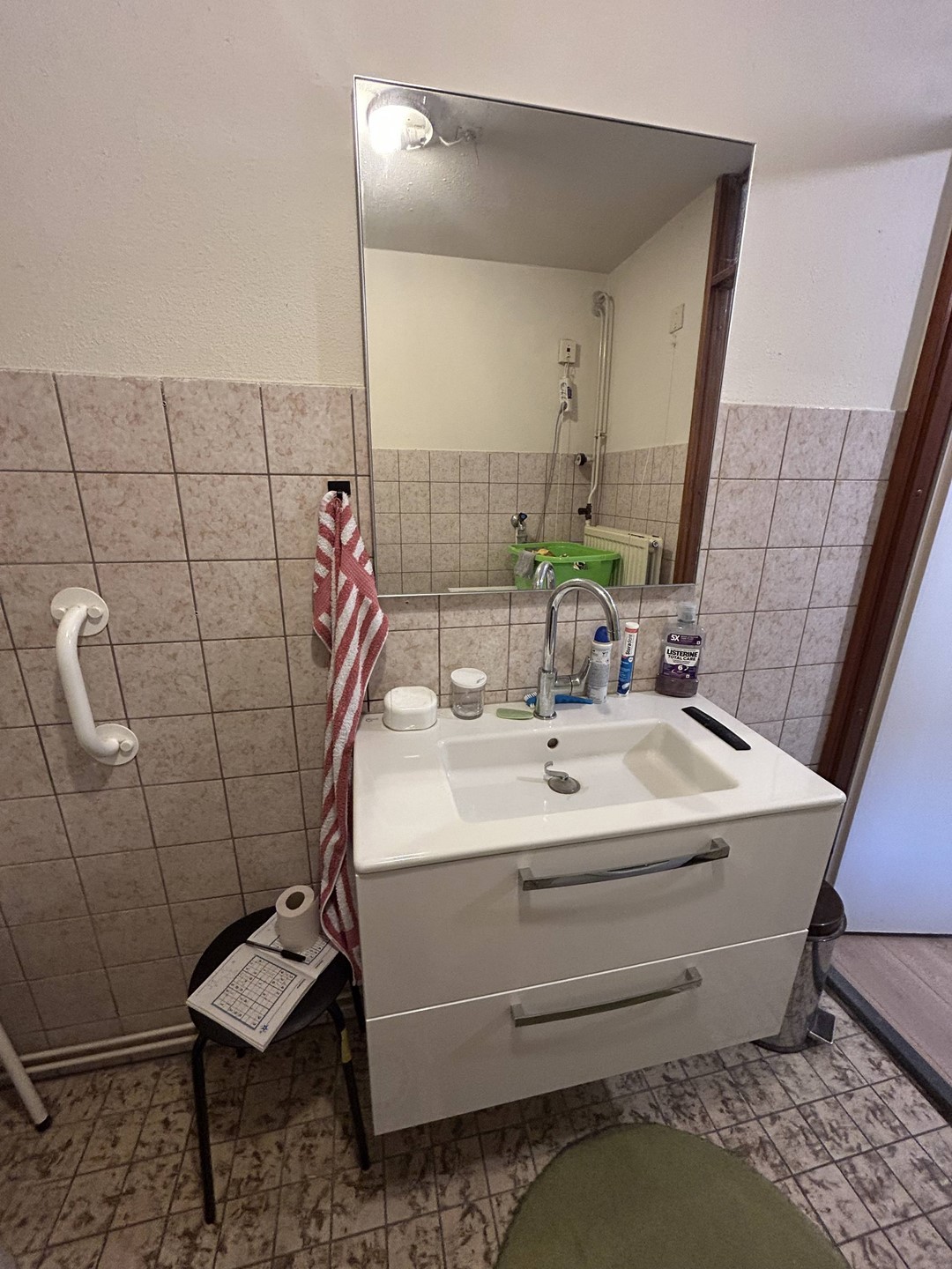 Badkamer: 2,55 x 1,70 met tegelvloer, douche met cabine, duoblok, badkamermeubel met wastafel en aansluitingen was-apparatuur.