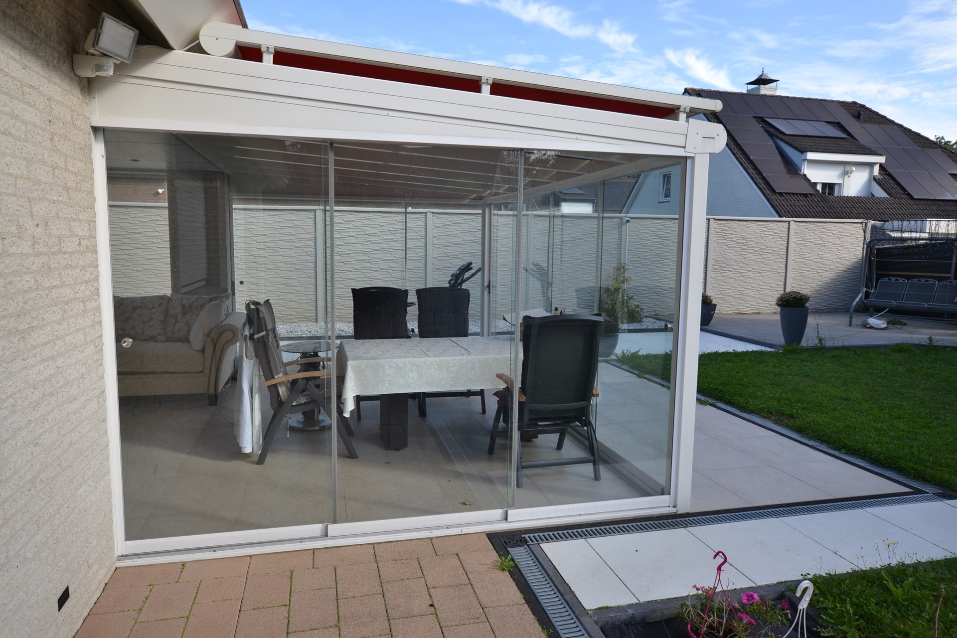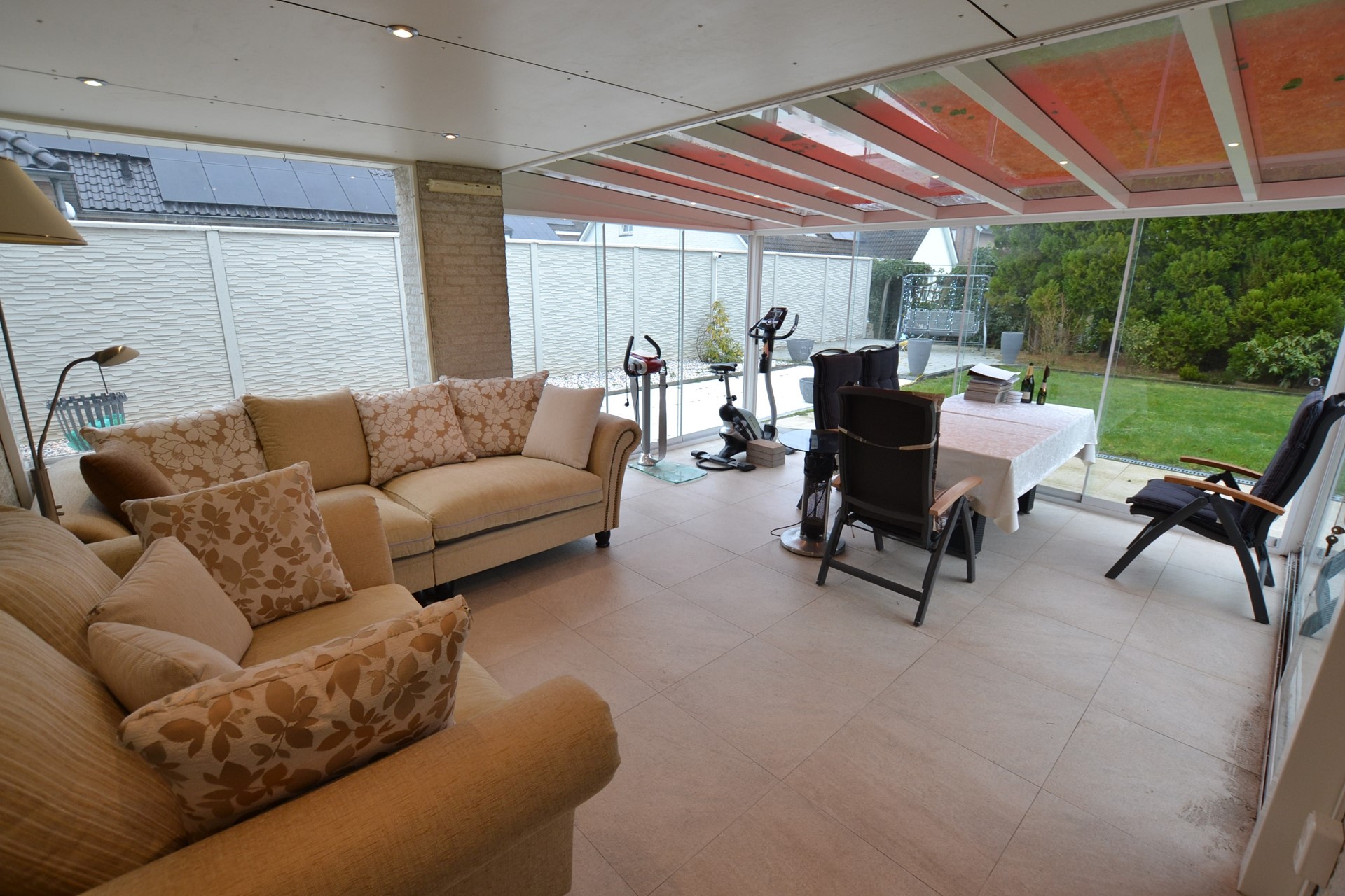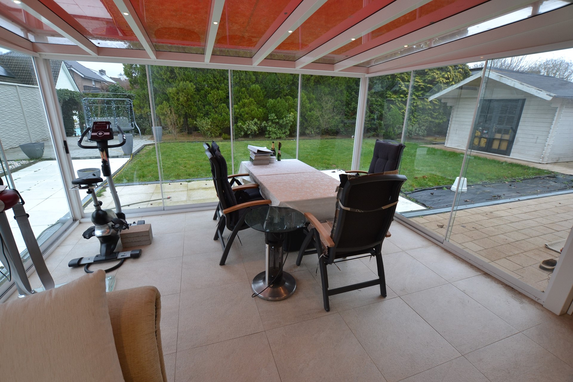 Hoogwaardige serre 5,50 x 4,20 met keramische geïsoleerde tegelvloer, LED-inbouwspots, 10 glazen schuifdeuren, elektrisch bedienbare zonwering en airco.