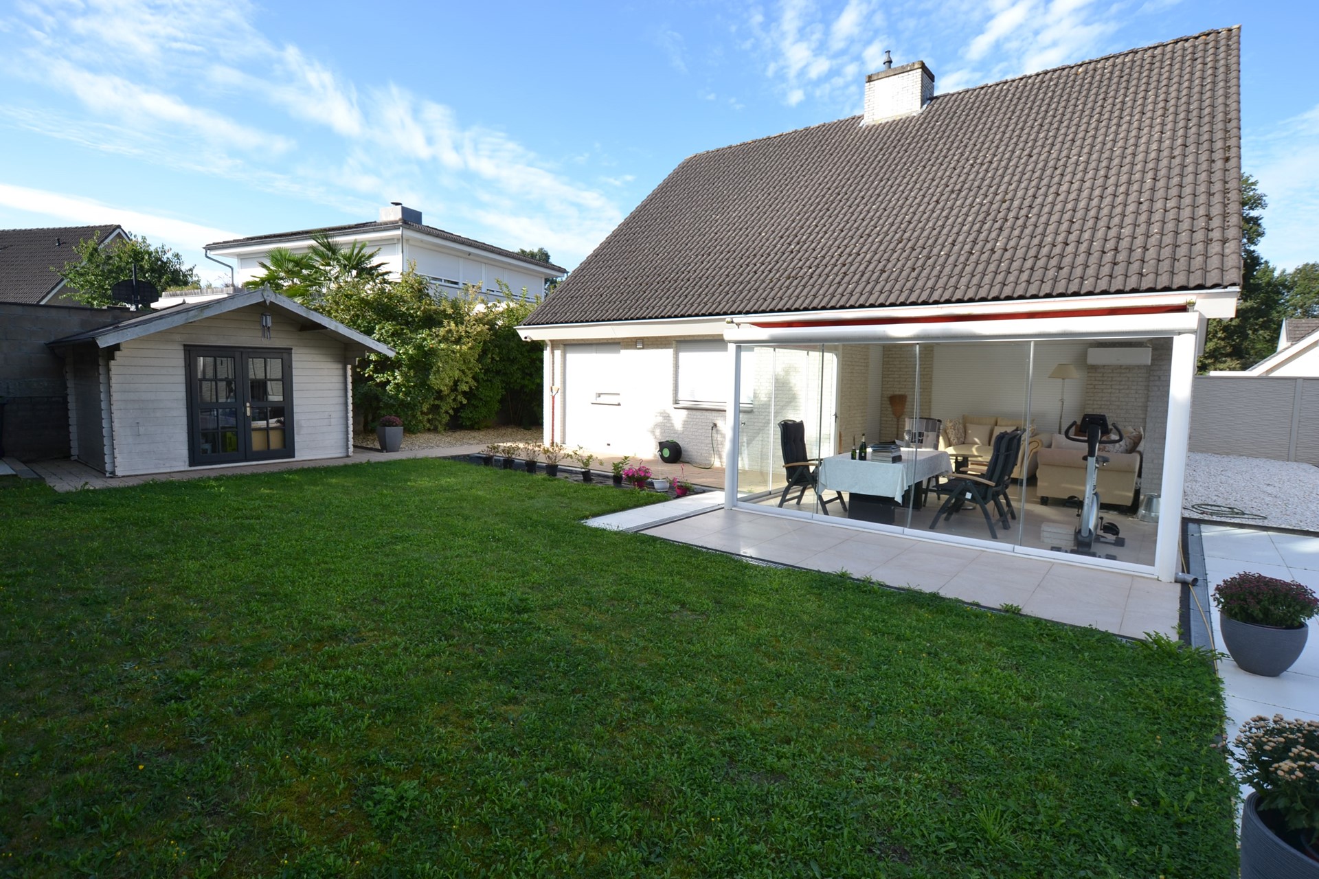 Achtertuin met ruime luxe serre, nieuwe bestrating, gazon, beplanting, muren, siergrind, houten tuinhuisje 3,55 x 2,75, tweede terras met voorbereiding om buitensauna met krachtstroom (twee groepen) te realiseren.
