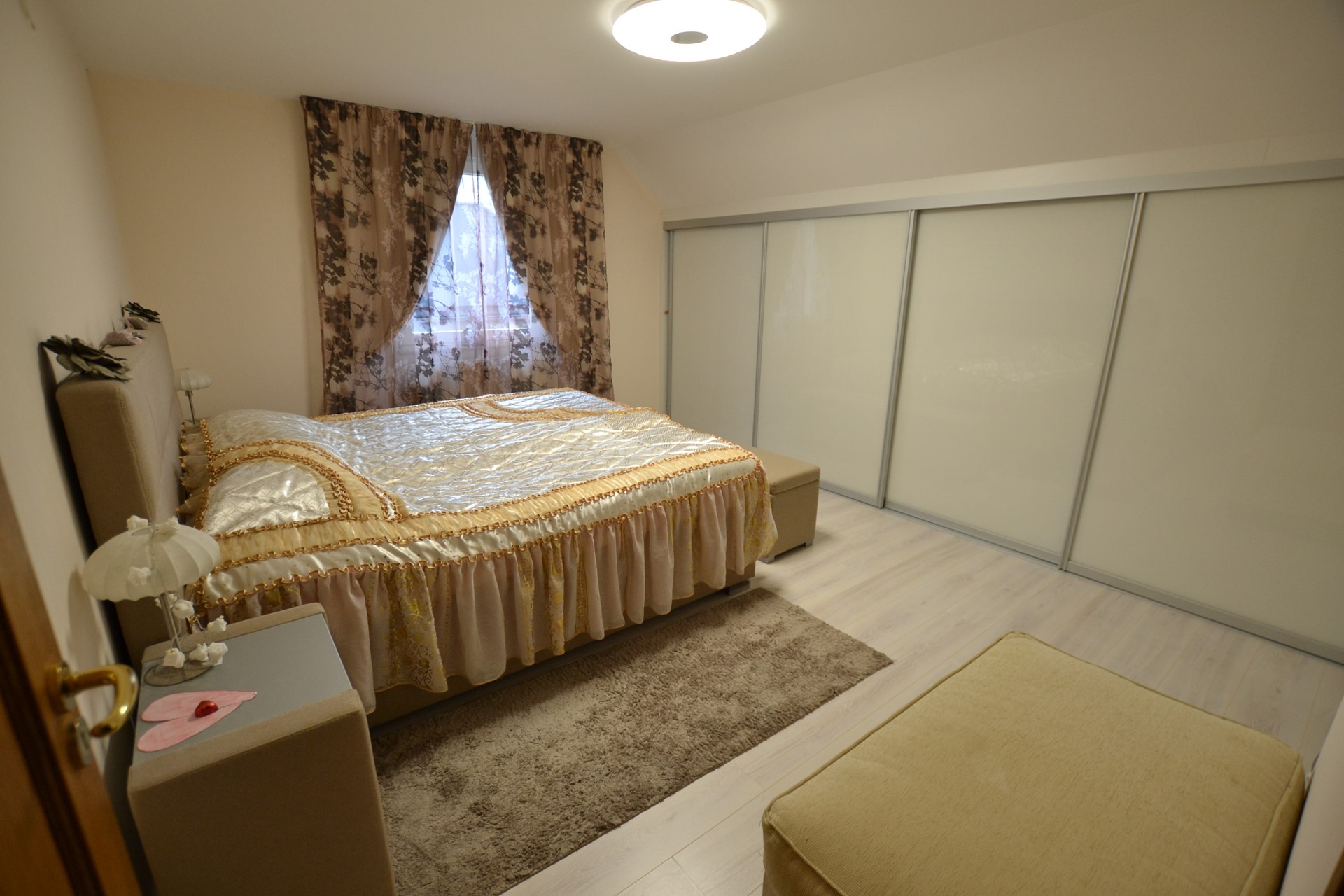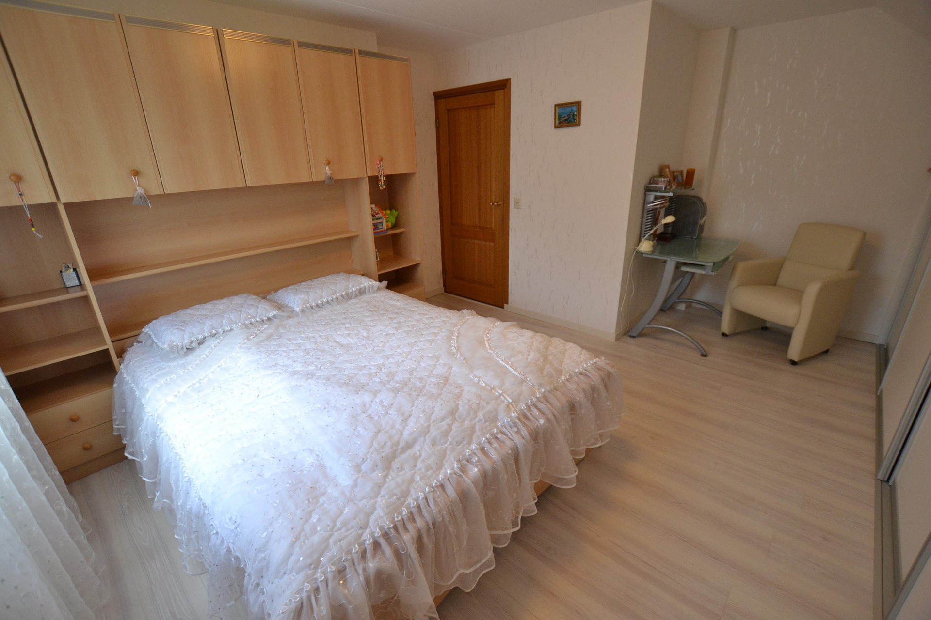 Slaapkamer 1: 5,75/4,45 x 4,10 met laminaatvloer en luxe ingebouwde kastenwand.