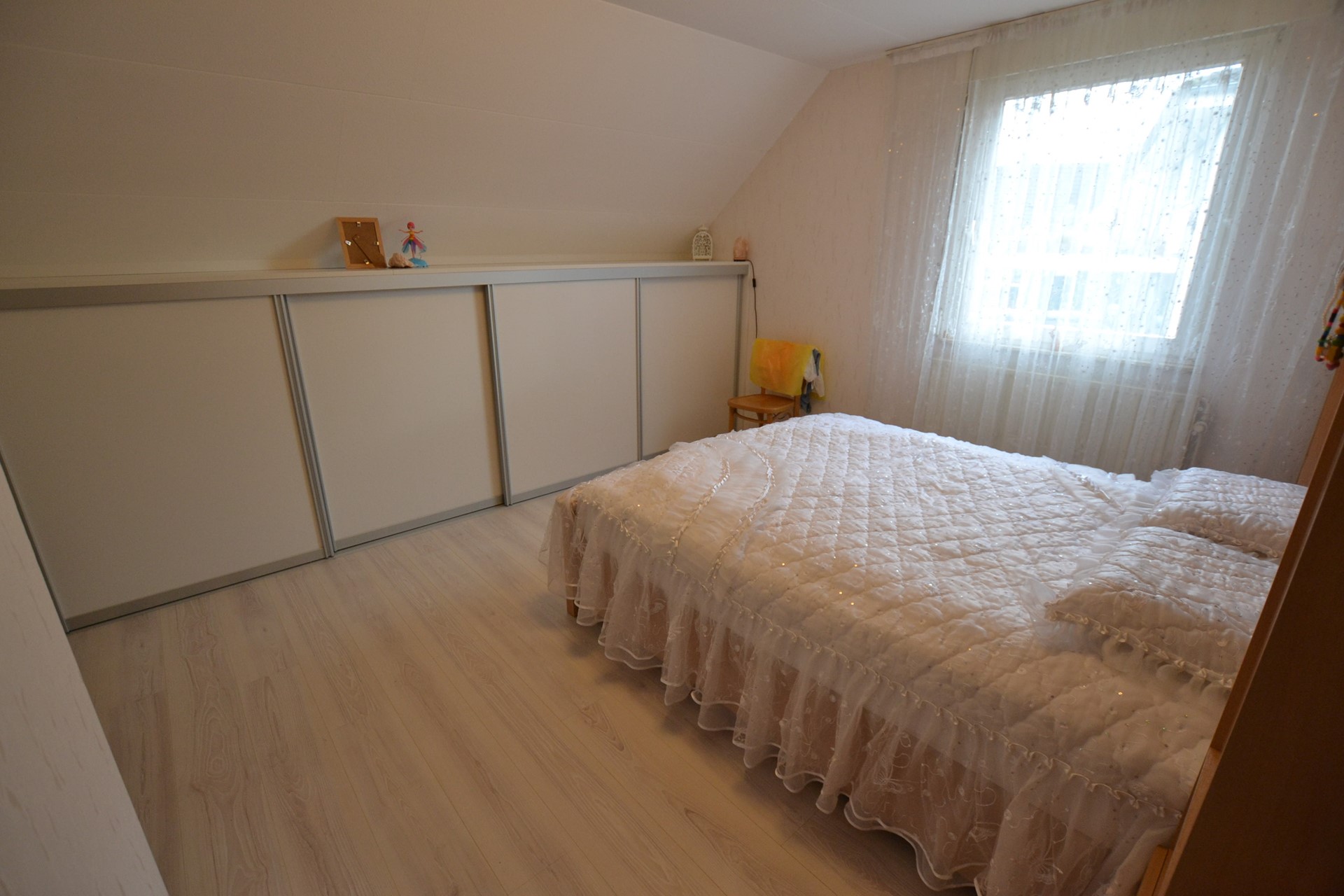 Slaapkamer 2: 4,95/3,65 x 3,90 met laminaatvloer en luxe ingebouwde kastenwand.