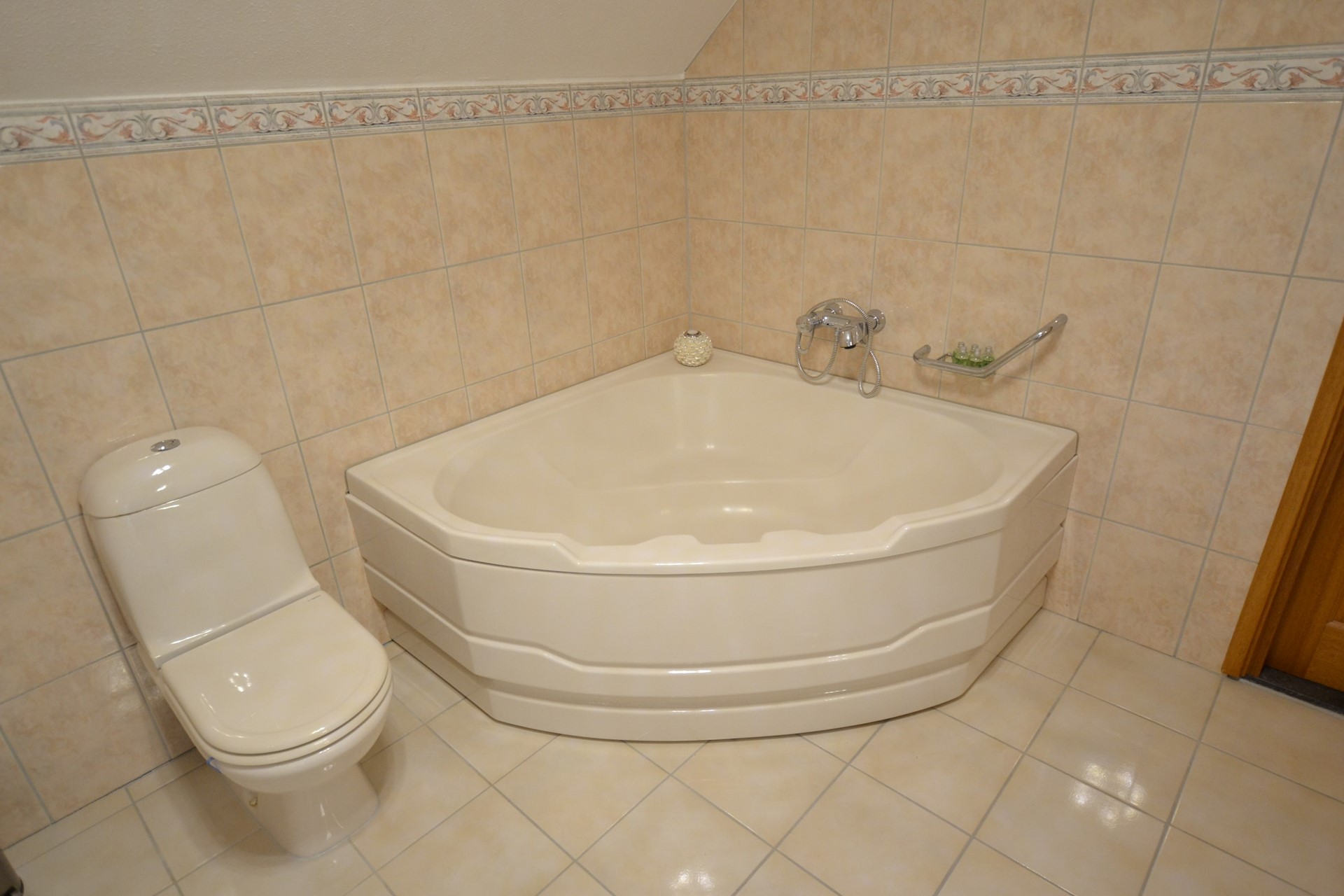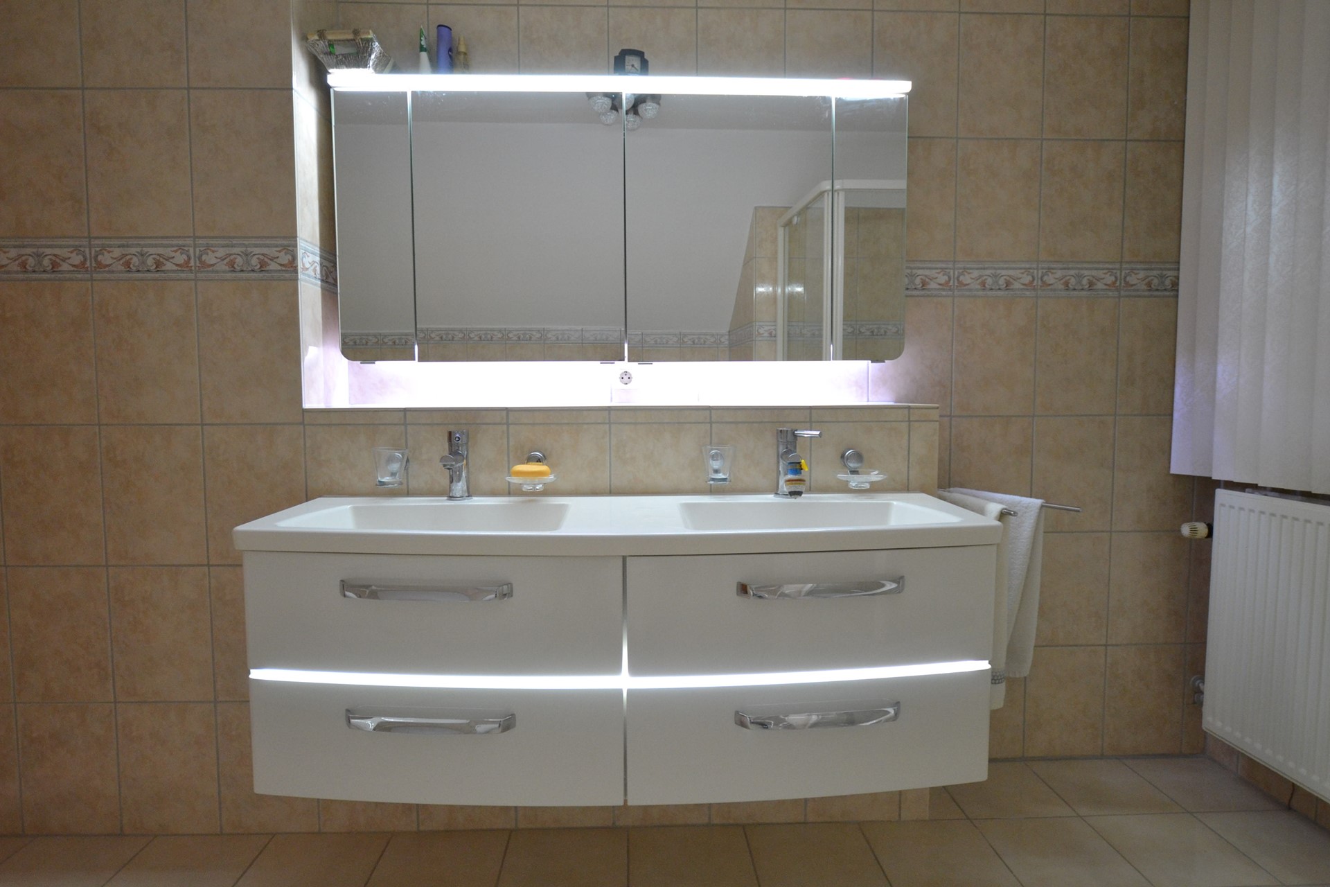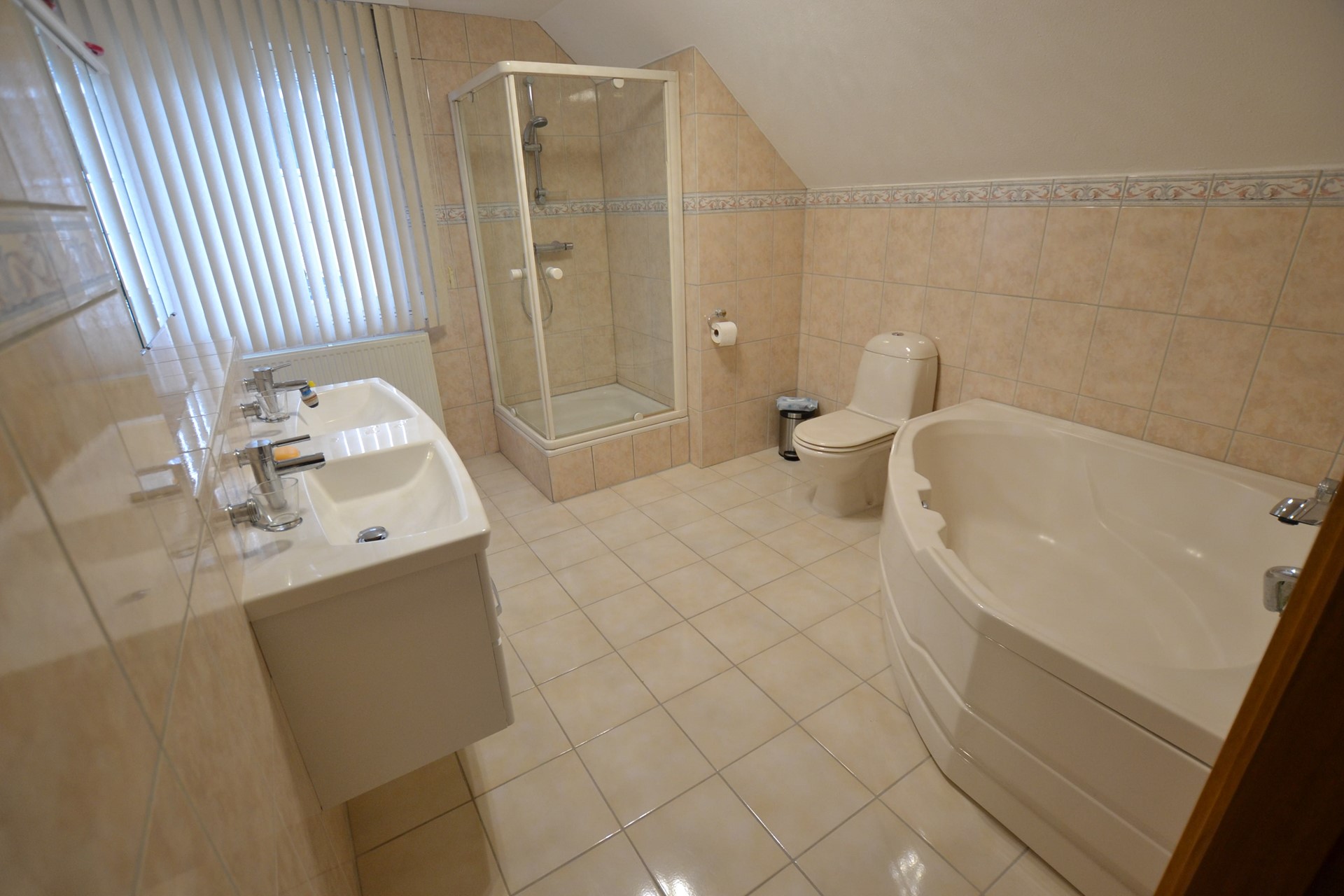 Badkamer 3,60 x 2,80 met plavuizenvloer, hoekligbad, douche met cabine, toilet en luxe badkamermeubel met dubbele wastafel.