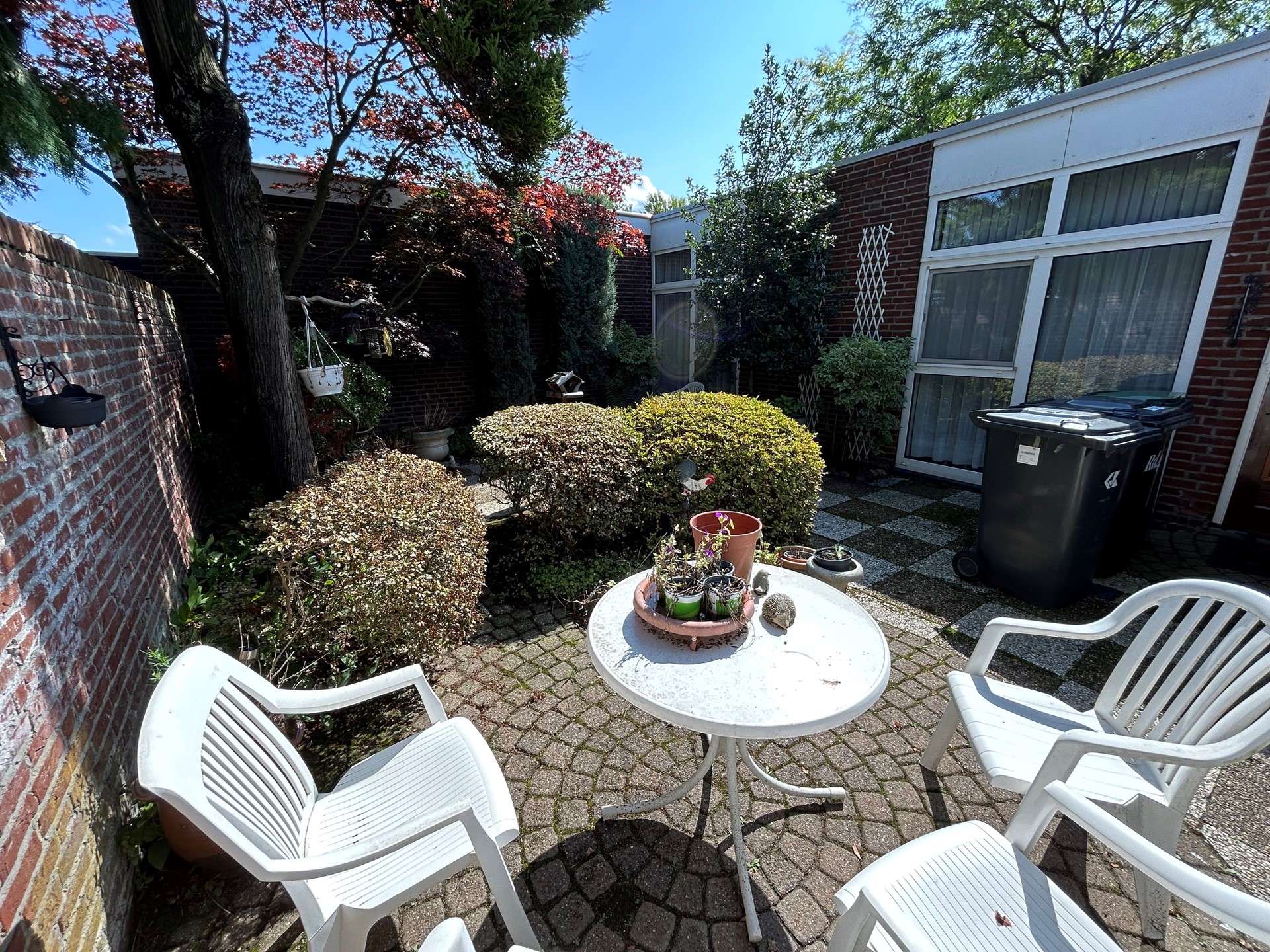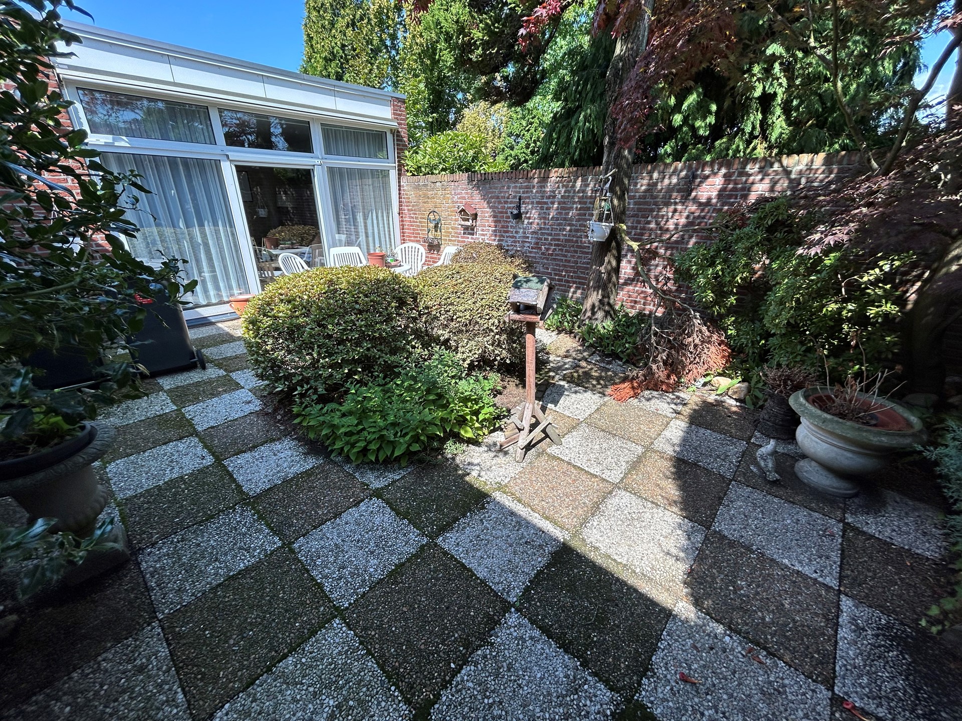 Achtertuin met bestrating, beplanting, muren en volop privacy.