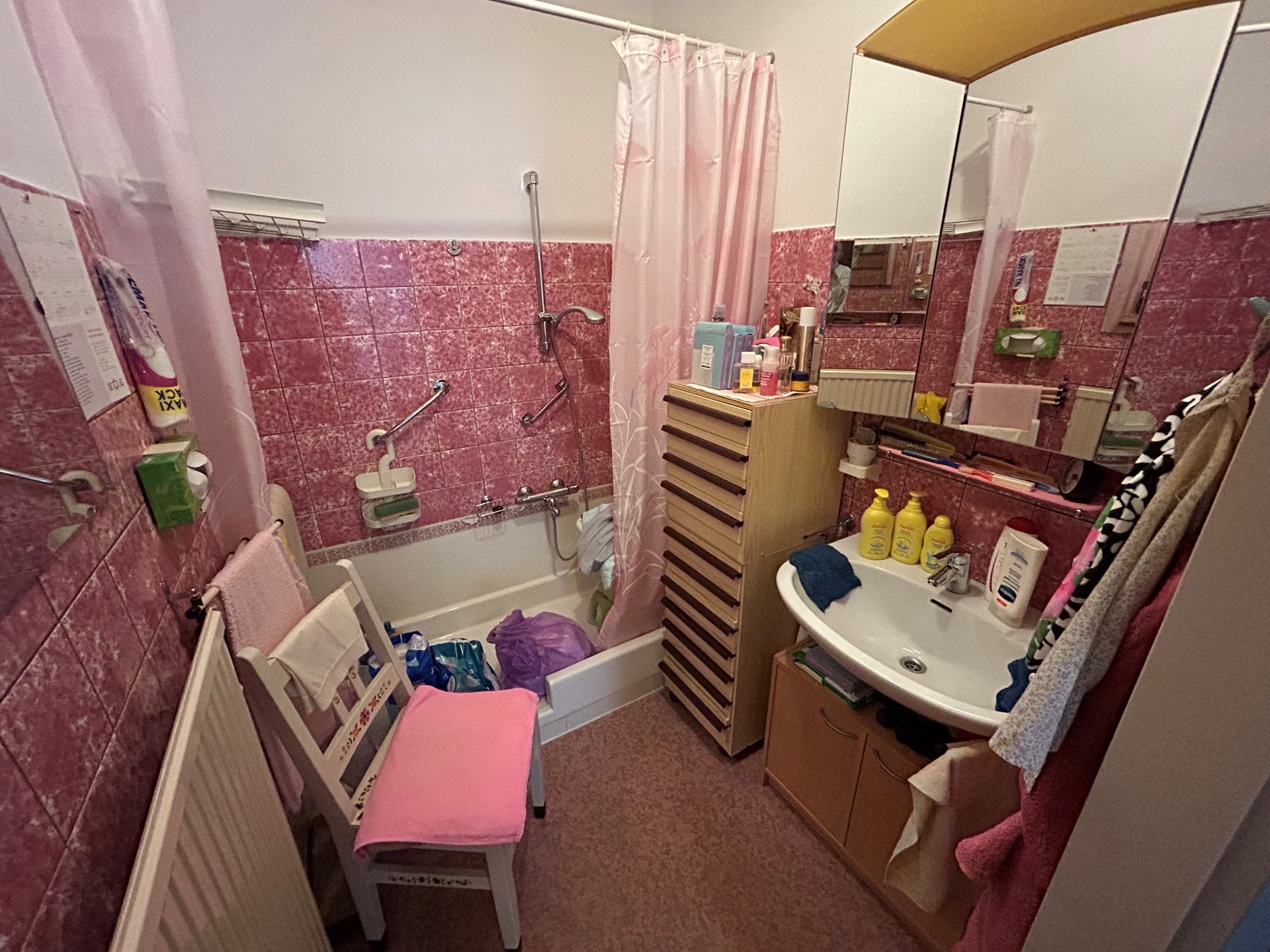 Badkamer 2,00 x 1,65 met novilon, douche en wastafel.