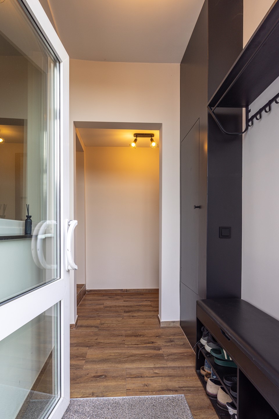 Via de entree kom je in de ontvangsthal, die is afgewerkt met een pvc vloer in houtmotief en geeft een verzorgde eerste indruk. In de hal bevinden zich de garderobe en de meterkast. Vanuit hier is er toegang tot de woonkamer en de keuken.