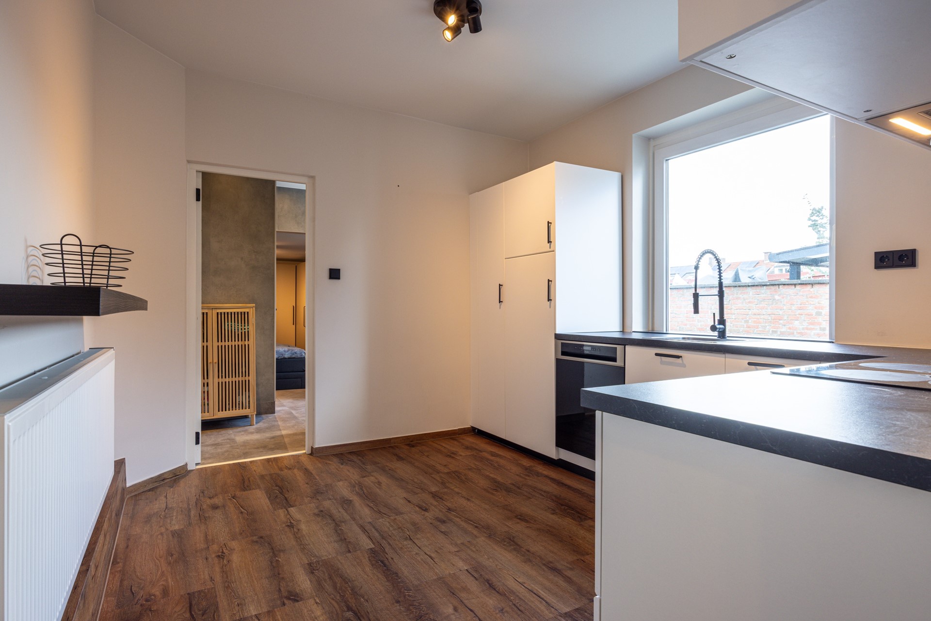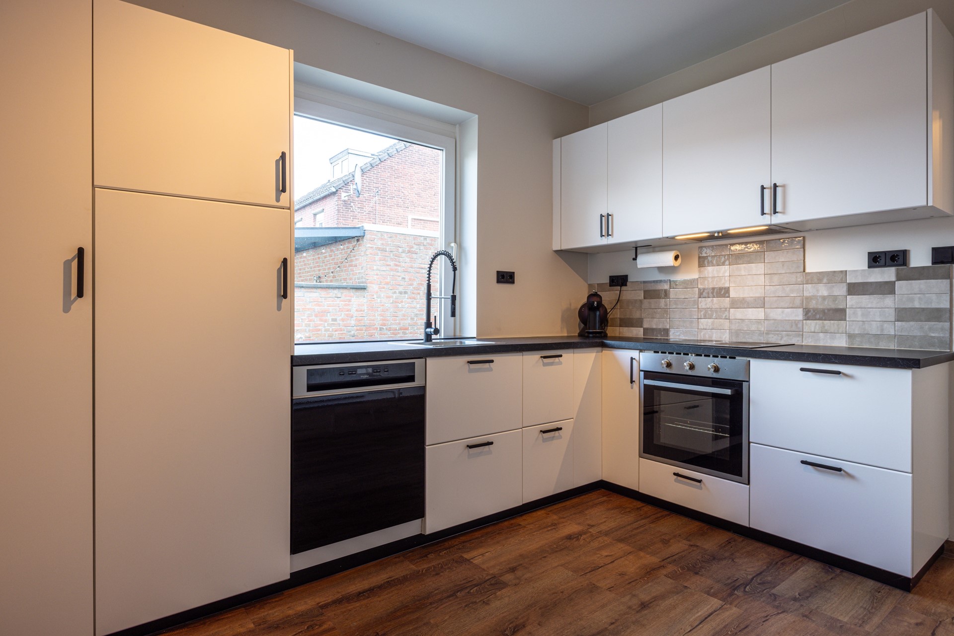 De gesloten keuken is praktisch ingericht en beschikt eveneens over een pvc vloer. De keuken is voorzien van inbouwapparatuur, waaronder een 4-pits inductiekookplaat, een onderbouw afzuigkap, een koelkast en een vaatwasser. Een functionele keuken met voldoende werk- en opbergruimte voor dagelijks gebruik.