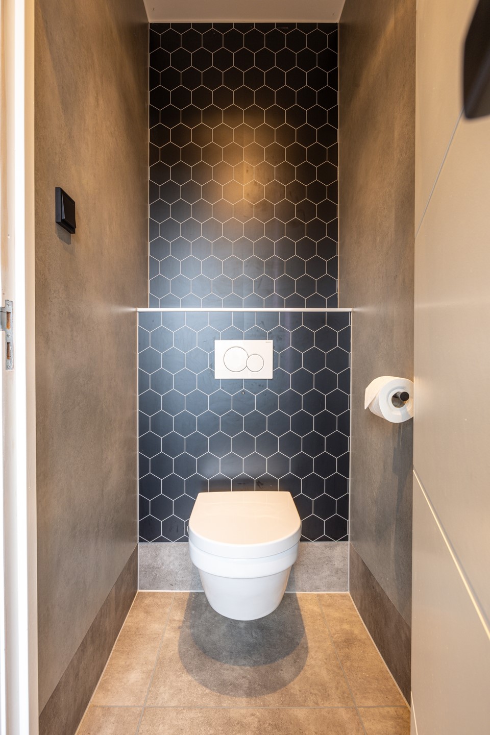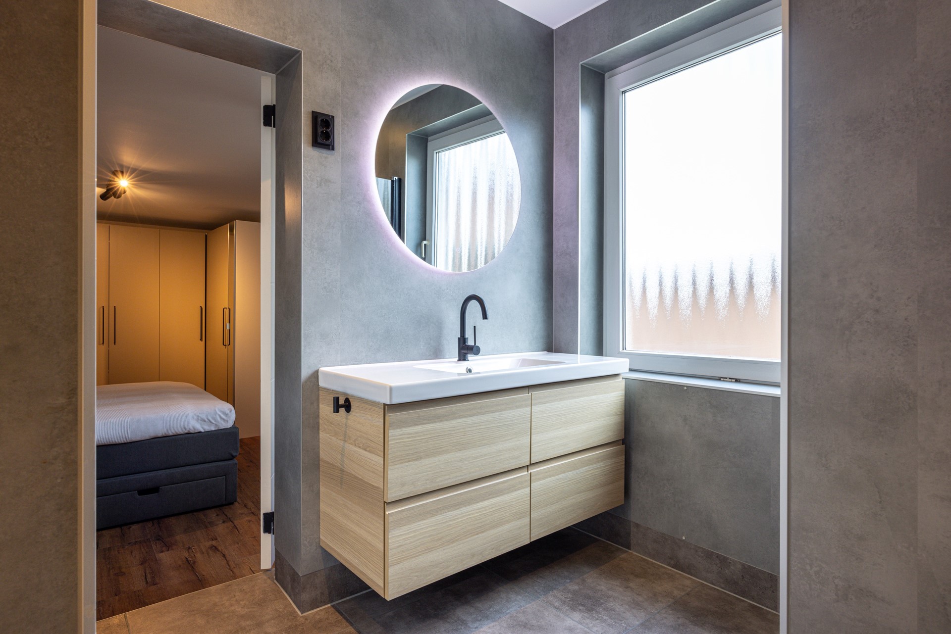De badkamer is praktisch en netjes ingericht en beschikt over een inloopdouche en een badkamermeubel met wastafel en spiegel met verlichting. Het toilet is uitgevoerd als een zwevend toilet en voorzien van een afsluitbare deur. De ruimte is afgewerkt met een pvc-vloer en houten wandbekleding die doorloopt tot aan het plafond, wat zorgt voor een warme en verzorgde uitstraling. Tevens zijn hier de witgoedaansluitingen gesitueerd. Het raam is voorzien van gesatineerd glas, wat zorgt voor daglicht in combinatie met privacy.