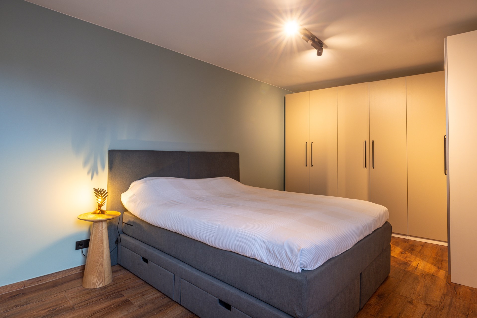 De slaapkamer is comfortabel van formaat en afgewerkt met een pvc vloer. Deze ruimte is voorzien van kunststof kozijnen met HR+ glas, een rolluik en airconditioning, wat bijdraagt aan een aangenaam binnenklimaat in alle seizoenen.