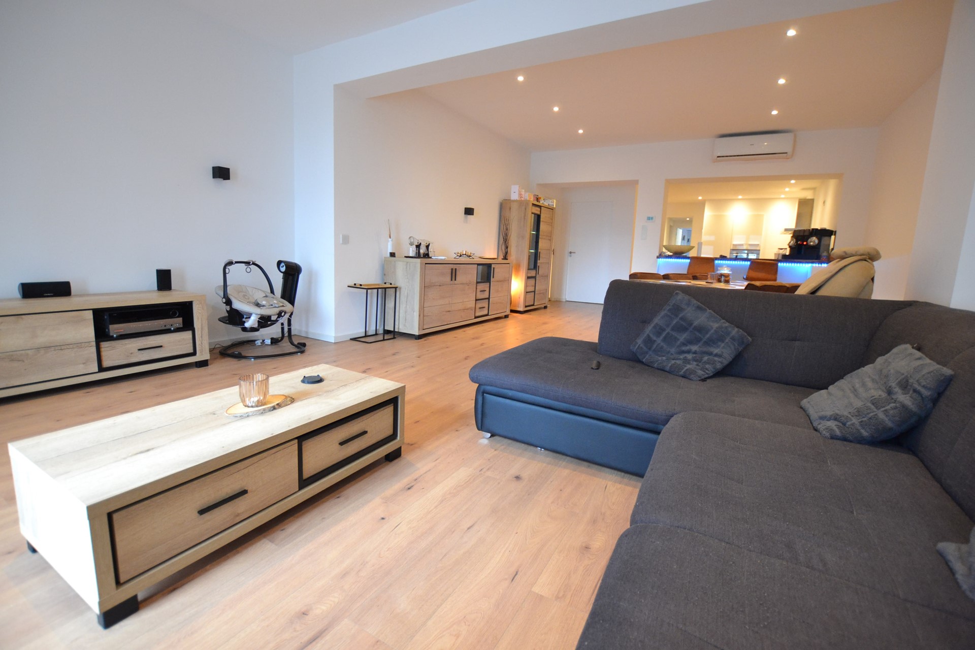 Woonkamer 10,45 x 5,50/4,95 met laminaatvloer, inbouwspots, airco, nieuwe meterkast met slimme meters en open keuken.